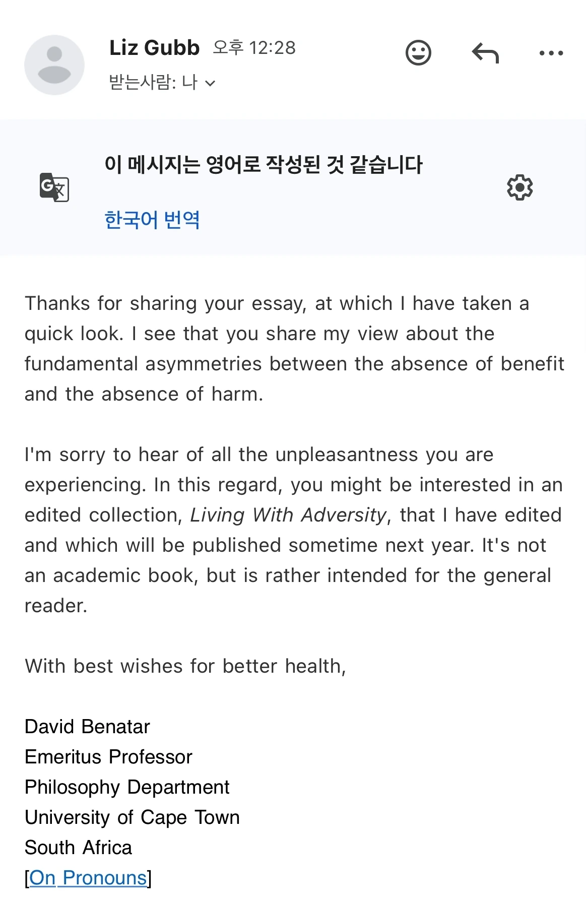 데이비드 베나타 교수님께 받은 메일(쾌락의 불평등 글 보냈었음)