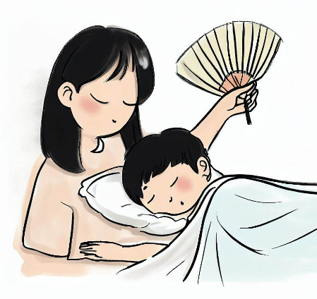 선풍기 머리를 나에게만 향하게 하고, 선풍기 옆에 살짝 붙어 아이에게 부채질을 하는데, 자기 가까이 오란다. 착 옆으로 누운 다음 내 남은 한 손을 잡아 자기 배 쪽으로 끈다. 그리고는 내 손을 잡은 채로 두드린다.
