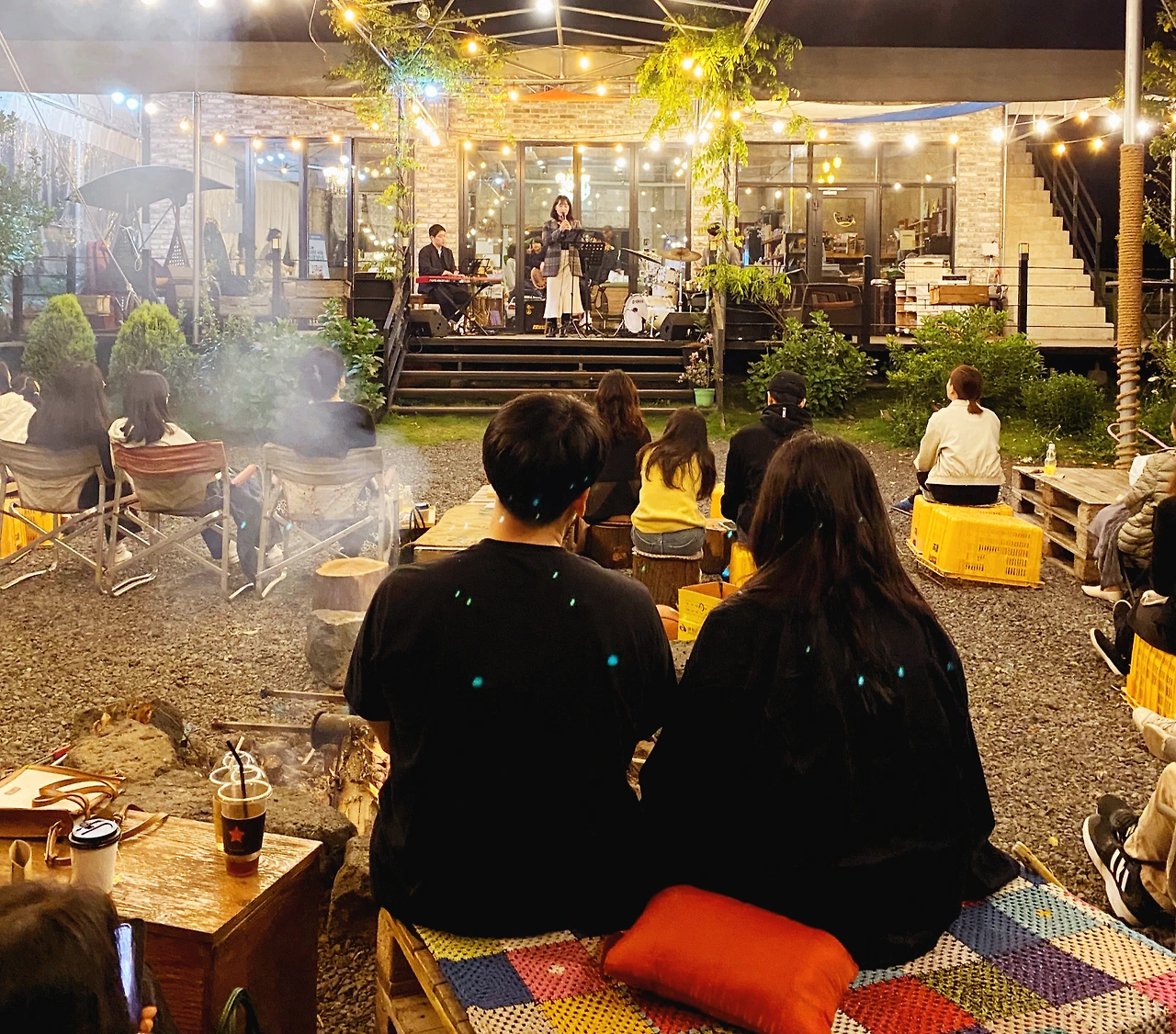제주에서 활동하는 재즈밴드 [시크릿코드], 당시 2019년 당시 세 번째 앨범을 발매하며 제주 민요를 담은 곡을 연주했다. 영주십경가, 오돌또기, 이어도사나 등 각 파트가 주고받는 리듬이 멋지게 어우러졌다. 시골 마을 그것도 중산간 마을에서 처음 열리는 재즈 음악회 소식을 듣고 모여드는 가족 단위의 손님들이 자리를 가득 메웠다. 처음으로 꽉 채운 풍경에 마음이 뭉클했다. 묵직한 베이스, 리듬감 완벽한 드럼, 현란한 손놀림 키보드, 스테레오를 가득 채운 기타, 울림이 깊은 보이스의 보컬이 함께 어우러져 귤밭 구석구석 스며들어 귤잎 위에서 반짝였다. 꿈같은 밤이다. 밤하늘의 별들보다 반짝이는 귤밭 Jazz 선율은 이 밤, 이곳에 모인 사람들의 마음에 달빛을 담아 건네주었다.