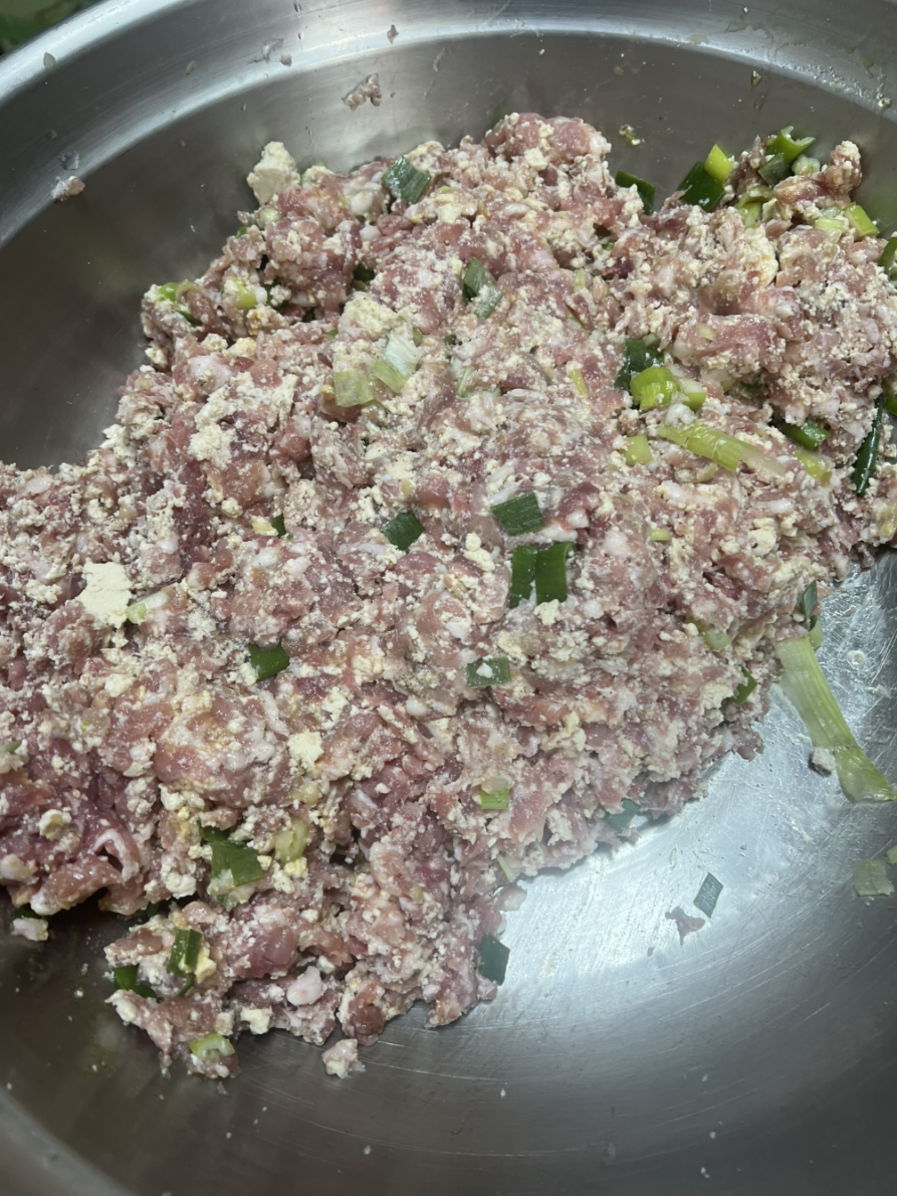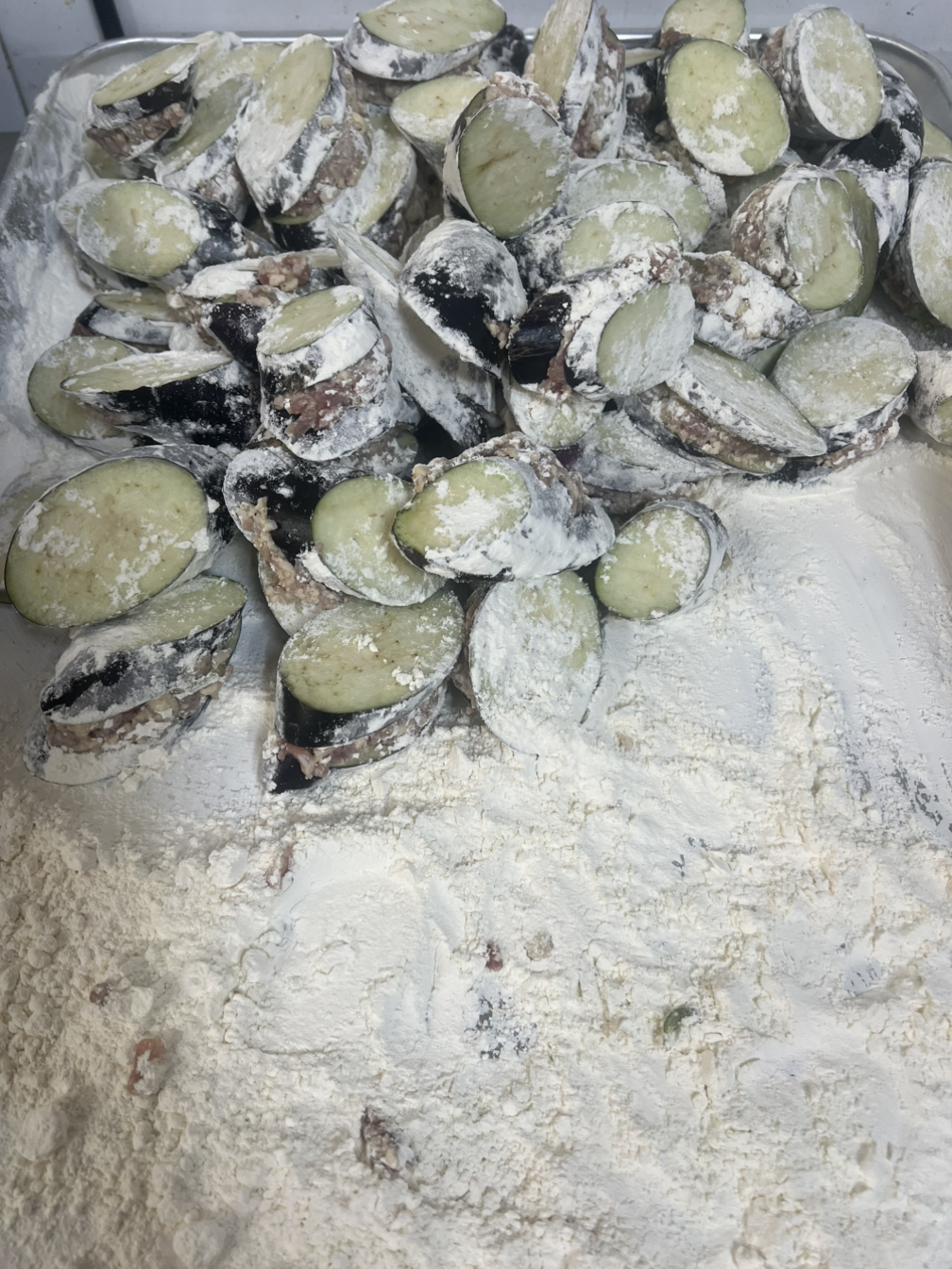 그렇게 칼집 넣은 가지속에 돼지고기와 두부 대파와 생강, 후추, 계란을 넣어 쉐킷쉐킷 한 소를 넣어 밀가루에 한번 묻혀 전분과 튀김가루 반반 넣은 반죽에 퐁당하여 튀겼답니다.