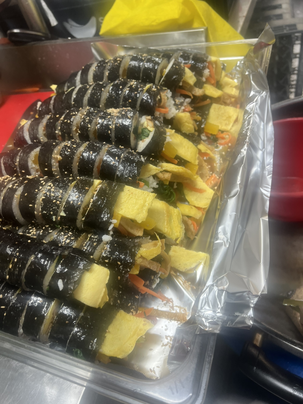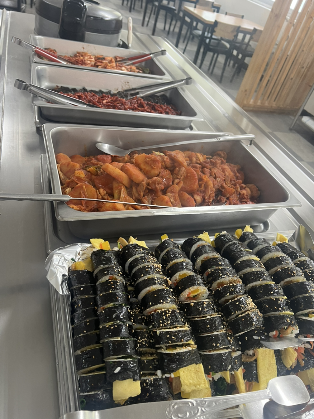 오늘 김밥은 어묵. 지단. 당근. 부추. 햄. 단무지가 들어간 김밥입니다. 무슬림식은 햄을 빼고 말아 드렸고요.