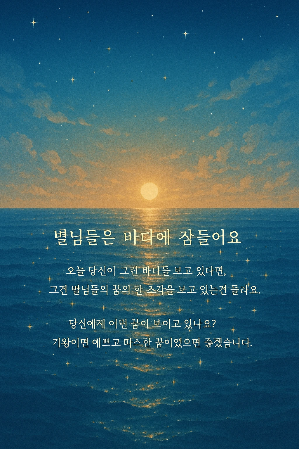 밤새 서늘한 바람은 잦아들고,한껏 반짝이던 별님들은 모두바닷속으로 살며시 잠을 청하러 갔어요.그건, 너무나 고요한 일이라 아무도 몰랐지만태양이 저 높이 비춰올 때면바다에 잠든 별들님의 빛이 바다 위로 떠오른답니다.오늘 당신이 그런 바다를 보고 있다면,그건 별님들의 꿈의 한 조각을 보고 있는 건지 몰라요.당신에게 어떤 꿈이 보이고 있나요?기왕이면 예쁘고 따스한 꿈이었으면 좋겠습니다.
