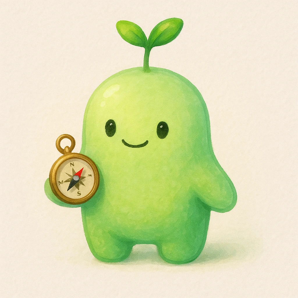 용기이는 투명한 초록색에 머리 위에는 새싹이 피어있고, 언제나 손 위에는 진심의 방향을 가리키는 나침반을 들고 있다.