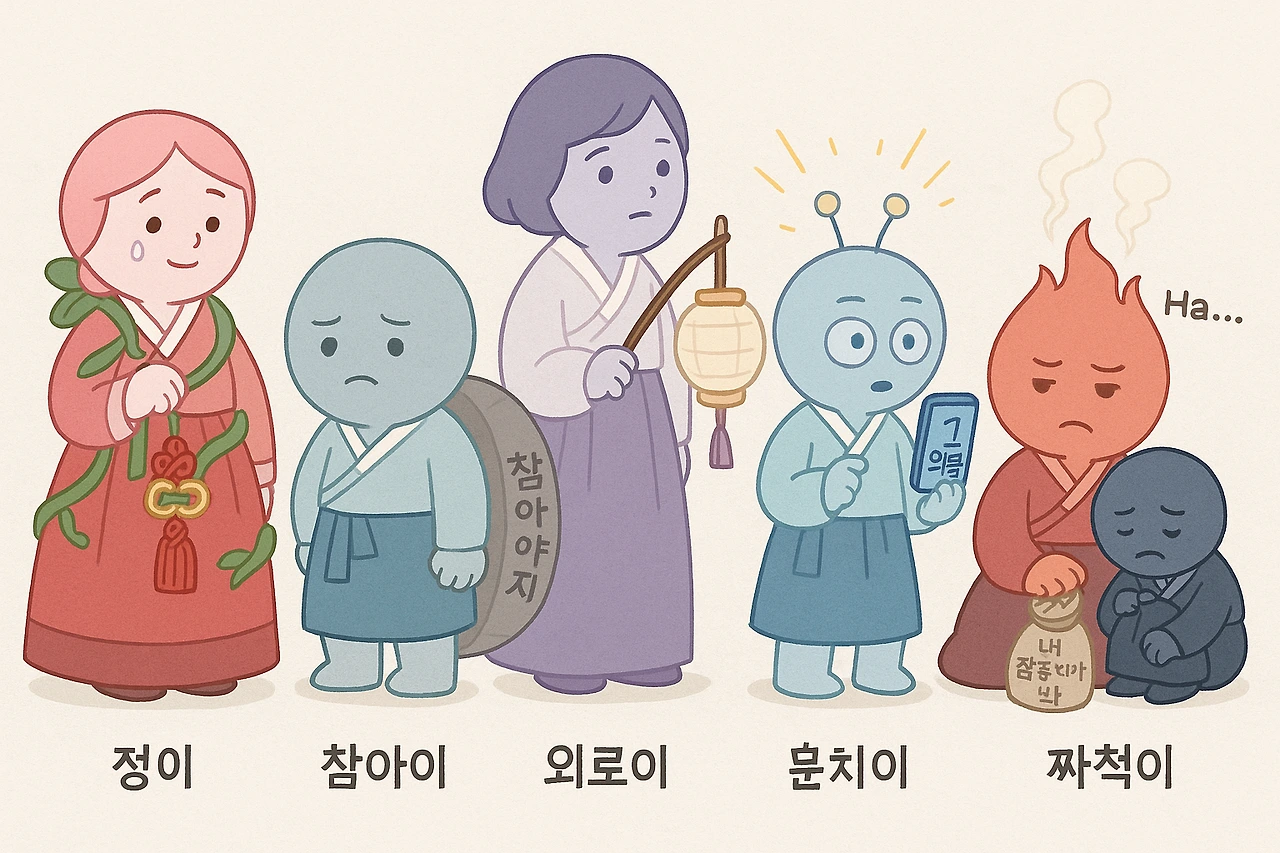 정이, 참아이, 외로이, 눈치이, 자책이