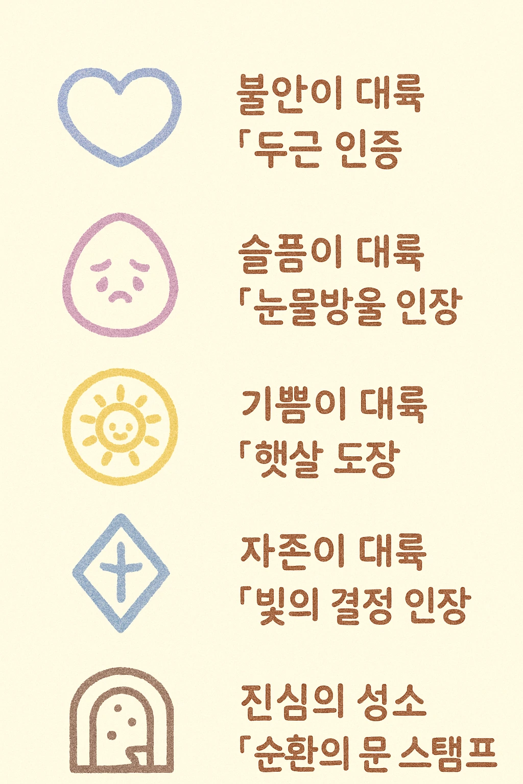 각 감정이 대륙을 여행할 때마다 도장을 찍는다.
