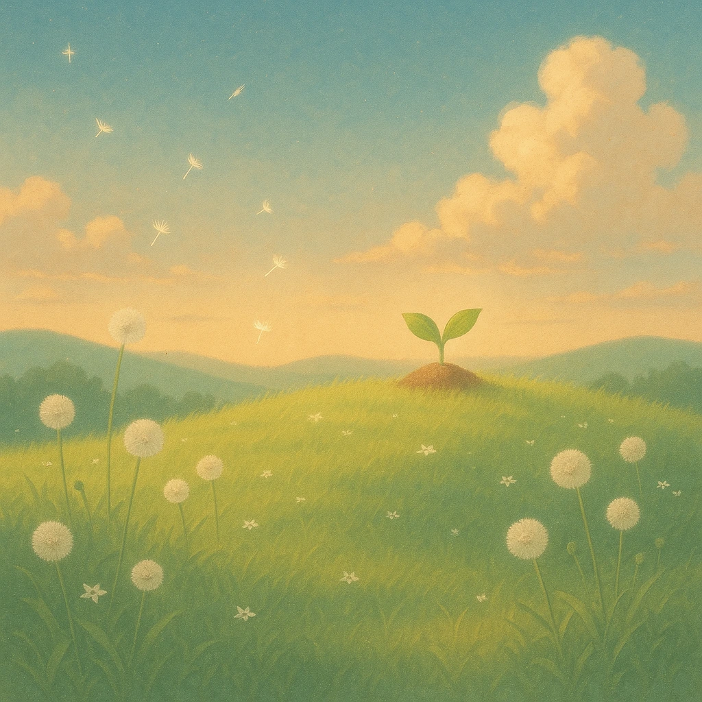 따스한 언덕 위엔, 민들레 홀씨들이 봄바람에 흔들리고 언덕 위에 조그마한 새싹이 하나 피었다. 편지로 적어, 내 마음속 언덕에 묻힌 글은 예쁜 꽃을 피우려 준비하고 있었다.