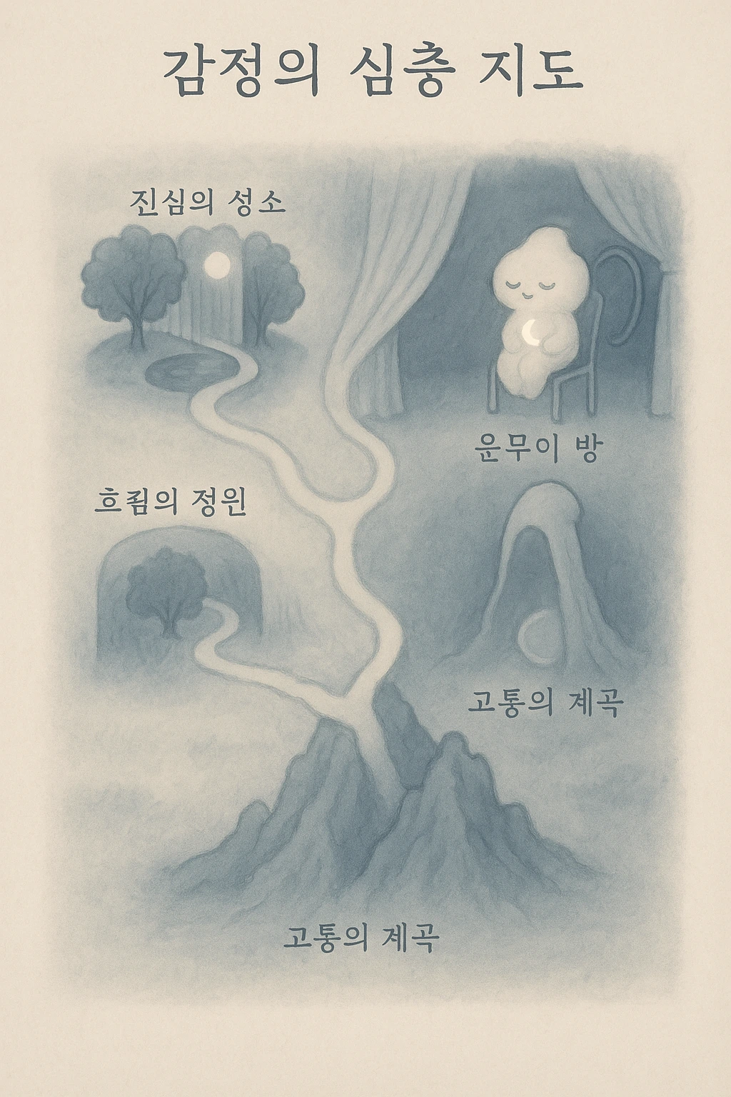 운무이의 손을 잡고 도달한 고통의 계곡은 진심의 성소 지하층, 슬픔과 불안의 대륙 사이를 지나 운무이의 흐림 정원을 통과한 뒤 아주 조용히 숨겨진 심층의 감정지대에 위치하고 있다.