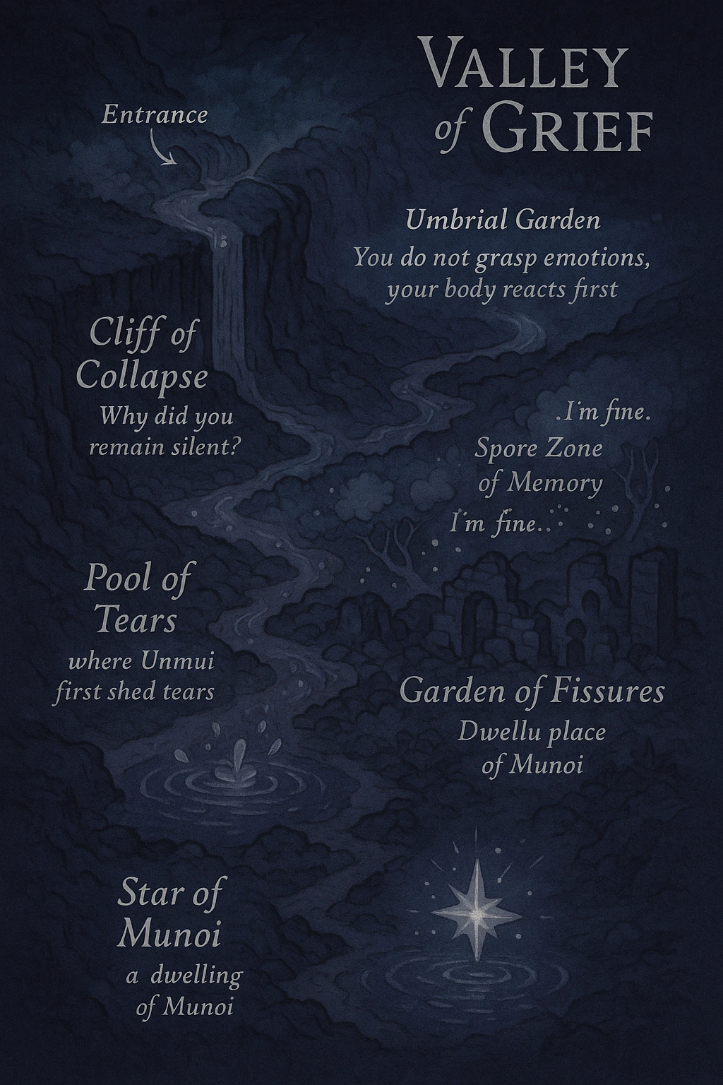 이곳은 감정이 언어화되기 전의 감각 상태로 존재하는 곳이다. 운무이의 안개가 얇게 깔려 있고, 주변 공기에는 과거의 기류, 눈물의 입자, 기억의 파편들이 섞여 있다.