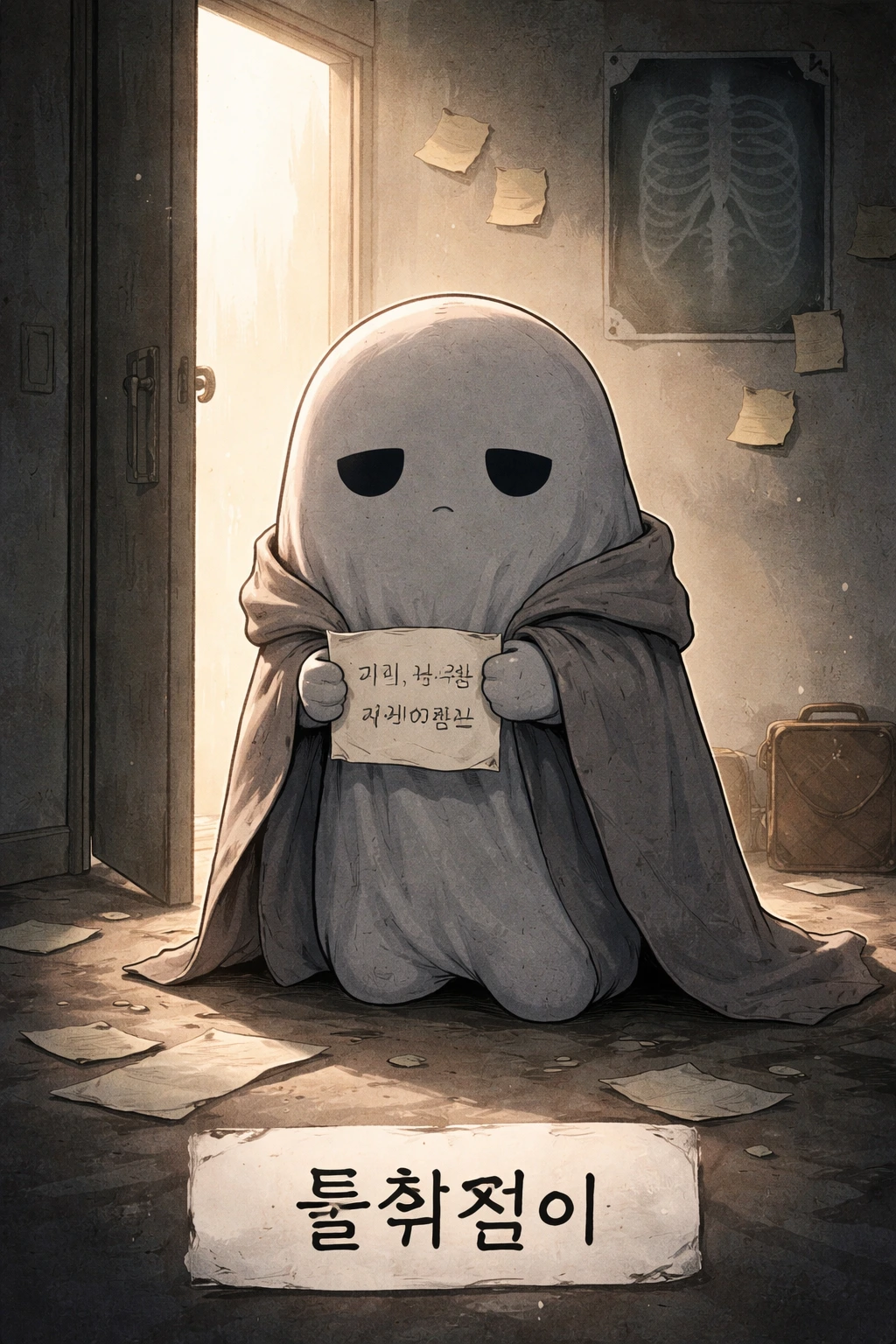 들춰짐이는 얇은 회색 외투를 입고 있는데, 그 외투가 자꾸 미끄러져 내려간다. 웃지도, 울지도 않는 표정으로 손에는 작은 메모지 하나 들고 있다. 거기에 적힌 글은 항상 같다.