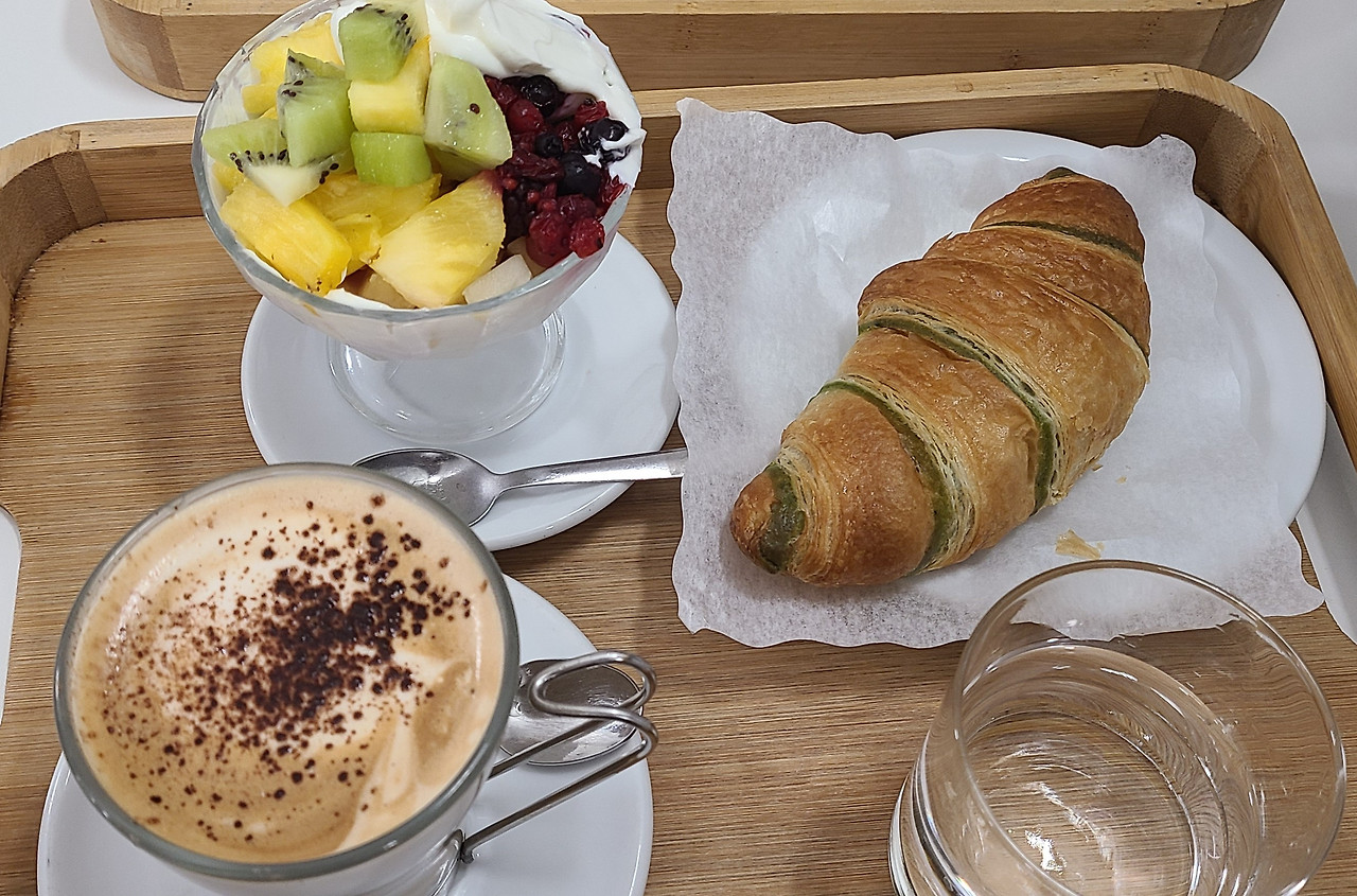 안쪽으로 들어가니 몇 개의 테이블에 한가한 여행자들이 늦은 조식을 먹는다. 크루아상 조식을 주문하니 과일과 요구르트 그리고 카페라테가 함께 나오는데