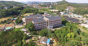여러 동의 건물이 낮은 산자락에 안겨 있는 모습이 평안해 보입니다.