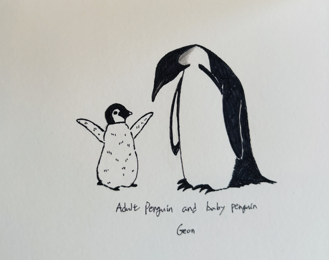 펭귄 한 마리가 새끼 펭귄 한 마리를 빙산 절벽으로 데려갔다.