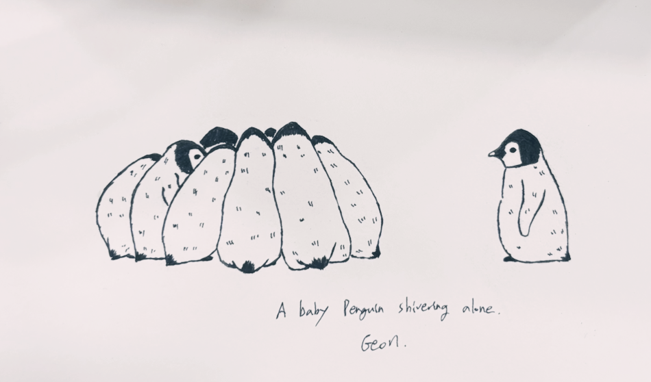 새끼 펭귄 무리가 둥글게 뭉쳐 추위를 버티고 있었다. 조금 떨어진 곳에 혼자 떨고 있는 새끼 펭귄이 있었다. 새끼 펭귄이 소리쳤다.