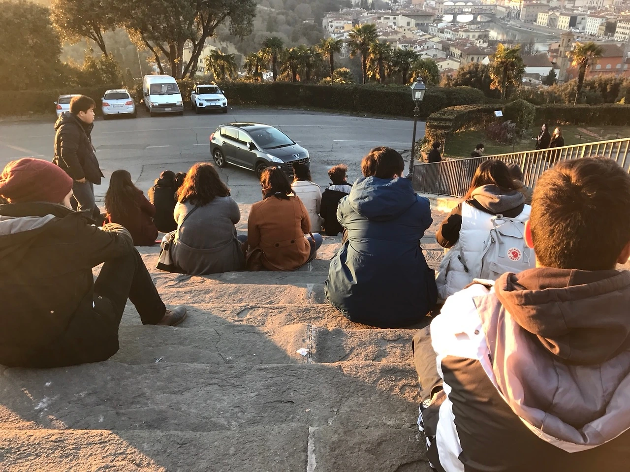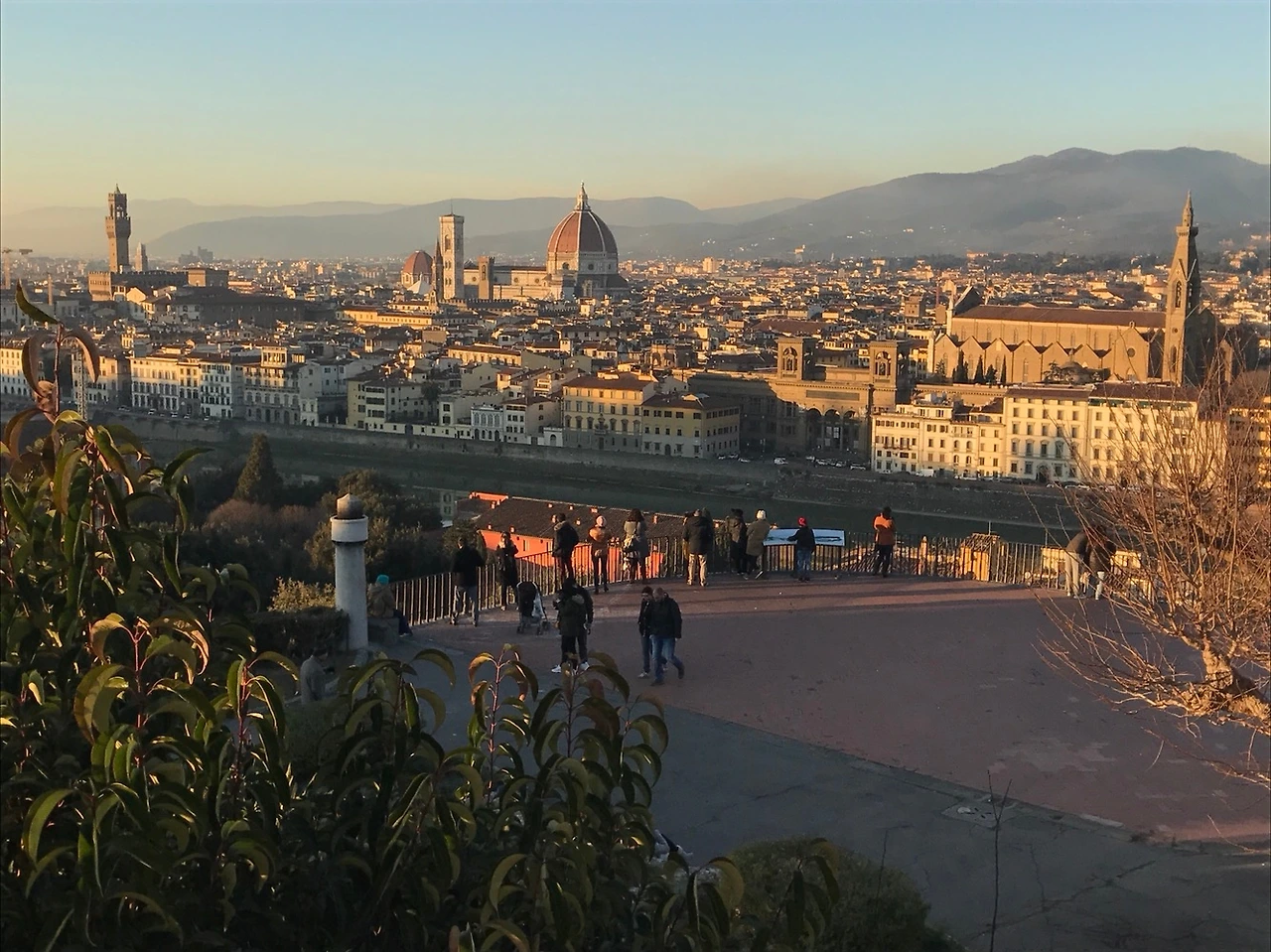 사람들이 이미 올라와서 경치를 구경하고 있었고, 몇몇은 계단에 자리를 잡아 앉은 상태였다. 당장 피렌체 시내가 한눈에 내려다보이는 전망대로 향했다. 붉은 기와지붕으로 가득한 풍경을 내려보고 있자니, 괜시리 마음이 따뜻해지는 것 같다. 한참을 서서 보는데 어디선가 기타 소리와 함께 노랫소리가 들려왔다. 사람들이 모여 있는 계단 쪽으로 향하니 그곳에서 누군가가 기타 연주와 함께 노래를 부르고 있었다. 사실 노을을 보면서 노래를 들으려고 이어폰을 가방 속에 꼭꼭 챙겨 왔는데, 필요 없는 헛수고였음을. 이렇게 멋진 배경음악이 따로 있을까. 나도 어느새 빈자리를 찾아 엉덩이를 계단 위에 붙인 후 한 발자국도 움직이지 않았다. 노을이 지는 아름다운 피렌체, 붉은 기와에 내리는 노을빛, 로맨틱한 기타 연주 그리고 노을을 보면서 행복한 미소를 짓는 사람들. 이 모든 것들은 내가 피렌체에 빠져들게 만들 만한 충분한 이유를 만들어 주었다.