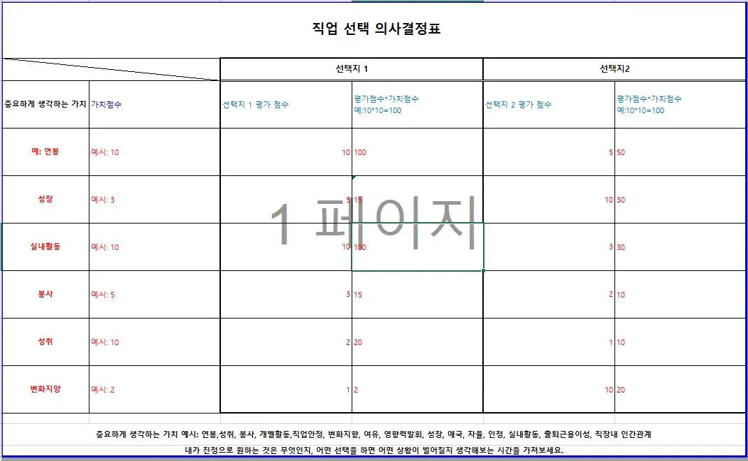 셋째, 직업을 선택할 때 충분히 고민하세요. 합격했다고 섣불리 입사를 결정짓지 마세요. 생각만 하면 머릿속에 복잡해집니다. 종이 적으면서 본인의 마음을 정리하세요. 정리해보는데 도움이 되는 직업선택 워크시트지를 파일로 첨부합니다. 직업선택을 하거나 진로를 선택해야 할 때 유용하게 쓰시길 바랍니다. 본인이 어떠한 것에 가치를 두는지 생각해보시고 중요하다고 생각하는 것을 몇 개 써보세요. 옆칸에는 가중치도 작성하고 숫자로 자신의 마음을 표현해보세요. 다 작성하시고 나서 전체 점수도 내보고 점수를 엑셀에서 그래프로 만들어보세요. 자신이 직업을 선택할 때 어떤 걸 중요하게 여기는지 직관적으로 볼 수 있습니다.