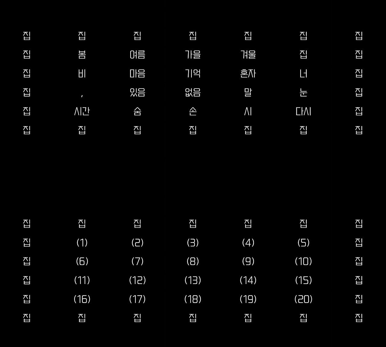 (1) 봄 (2) 여름 (3) 가을 (4) 겨울 (5) 집 (6) 비 (7) 마음 (8) 기억 (9) 혼자 (10) 너