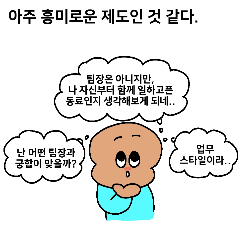 보통 팀은 팀장은 스타일에 맞춰가기 때문에 팀원이 팀장을 고를 수 있는 제도가 있었다면 훨씬 더 빠르게 합이 맞는 팀을 만날 수 있었을지도 모른다.