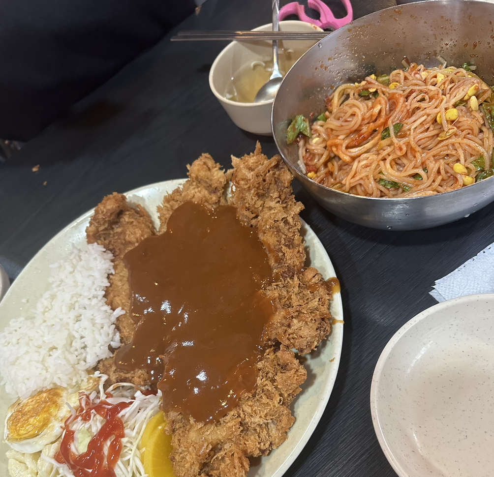돈까스에 쫄면을 시키길 잘했다며 잠시 자화자찬을 나눈 뒤 우리는 양쪽에서 돈까스를 썰기 시작했다.