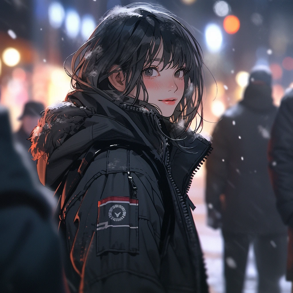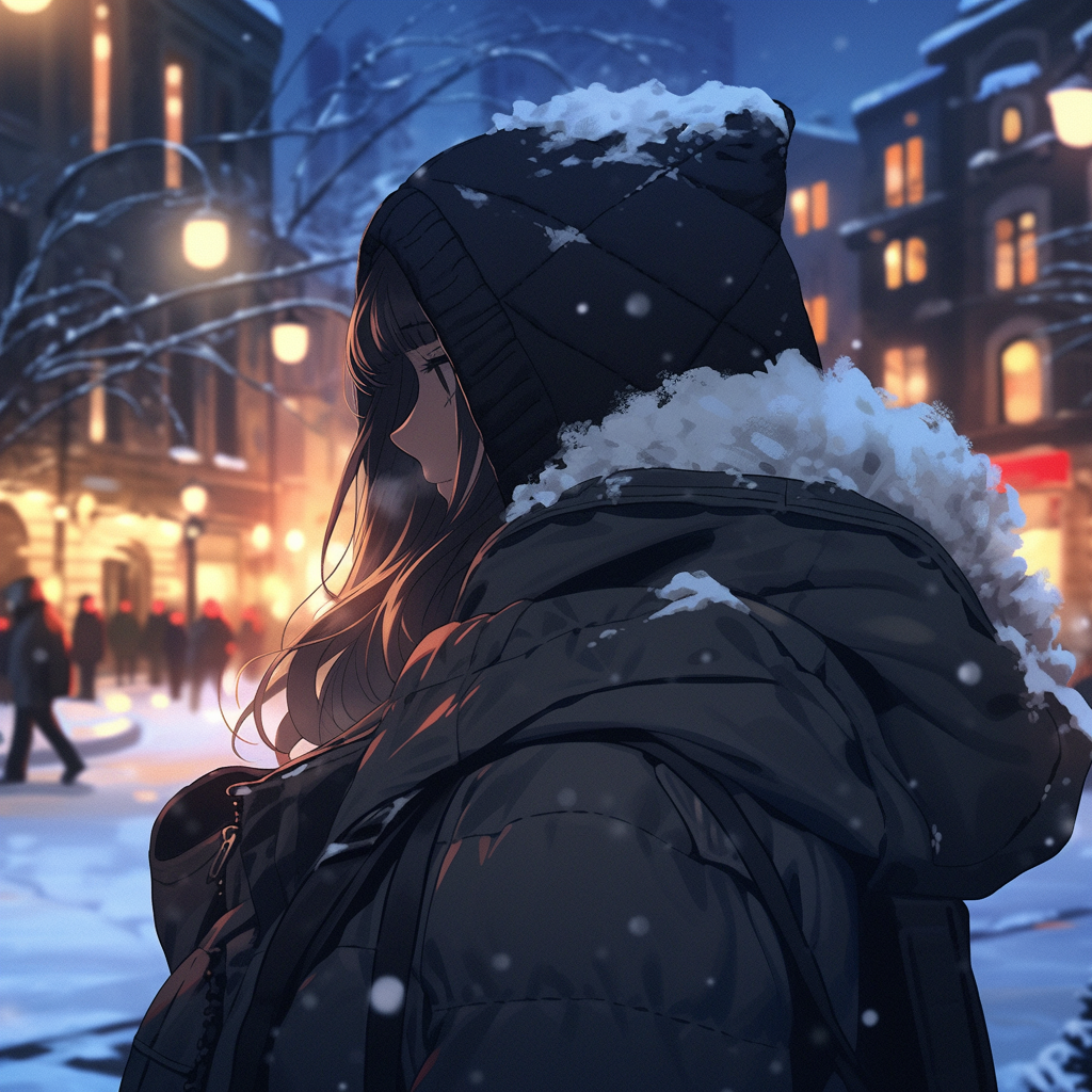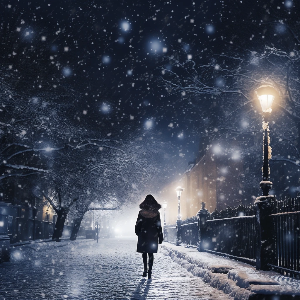 눈 오는 날 혼자 걷고 있는 여자를 그려주세요.