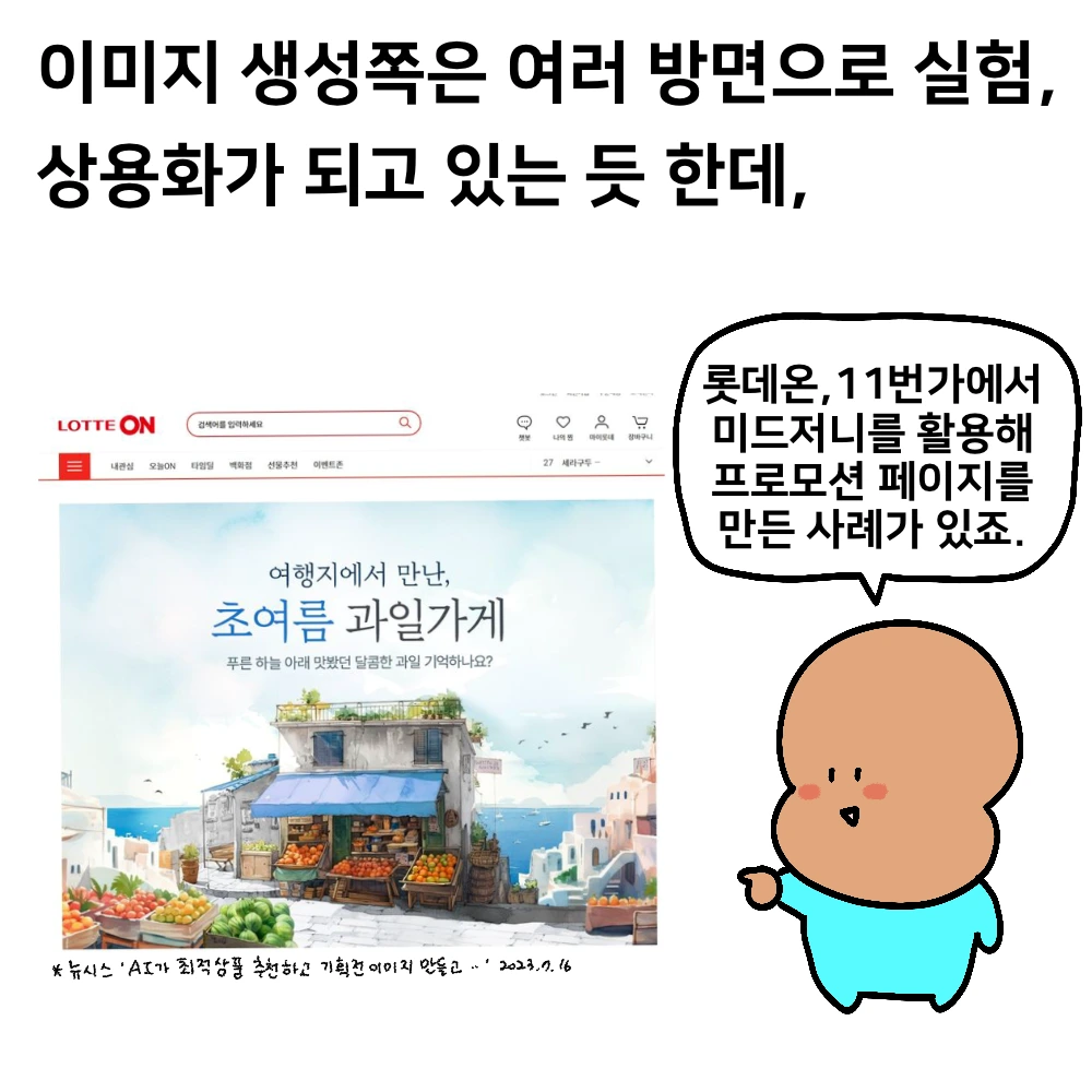 이미지 생성형 AI인 미드저니나 달리, 스테이블 디퓨전 같은 롯데온과 11번가에서 기획전, 프로모션 페이지에 활용했던 사례가 있을 만큼 상용화가 빠르게 이루어지고 있다.