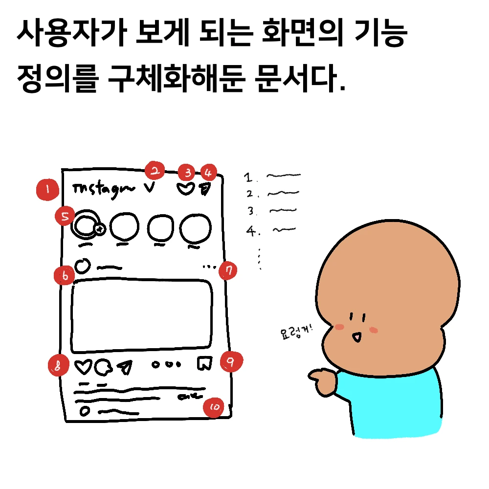 UID는 user interface description으로 다르게는 화면설계서, 와이어프레임, 상세기획서, 스토리보드라고도 부르는 문서다. 말은 다 제각각이지만 사용자가 화면상에서 보게 되는 화면에 대한 동작, 기능들을 구체적으로 정의해 둔 문서다.