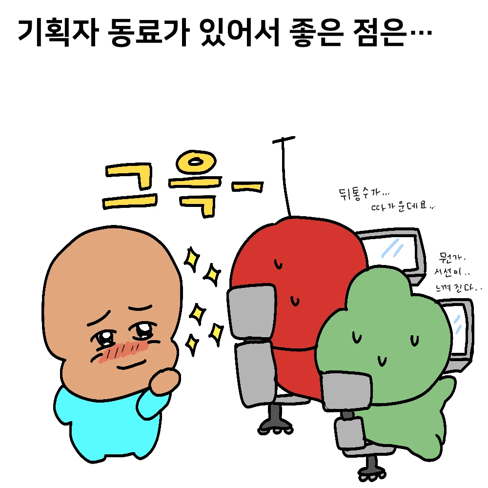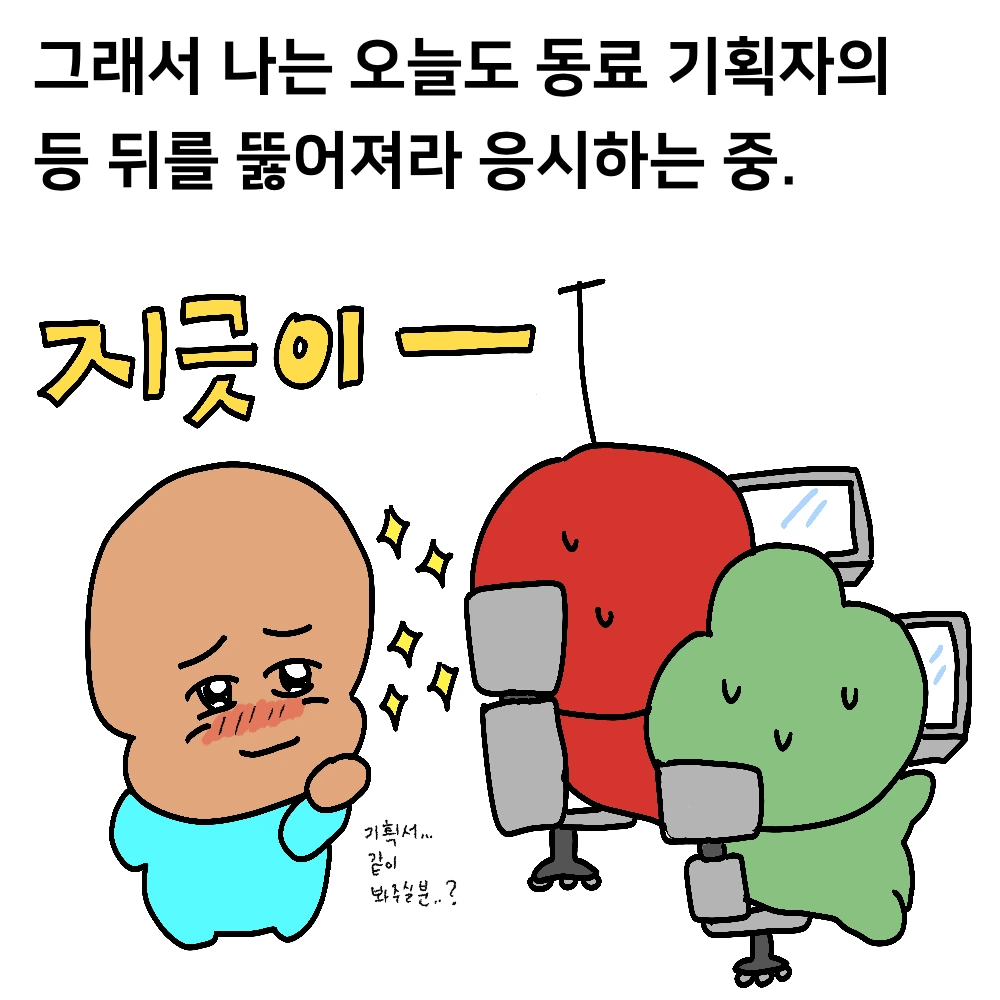 업무적으로든 잡담이든 할 얘기가 생기면 지긋이 동료 기획자의 뒤통수를 응시하고 있으면 용케 시선을 알아차리고 대화를 나눠주는 동료들!