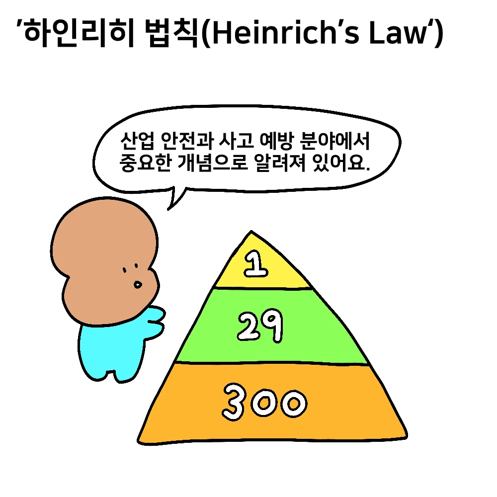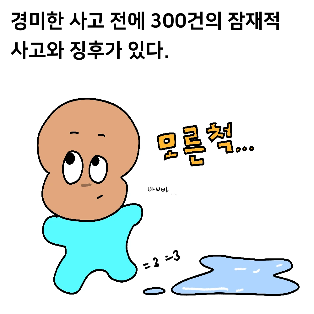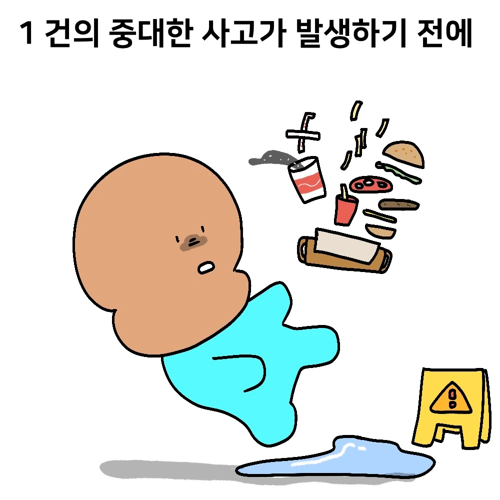 1건의 중대한 사고가 발생하기 전에 29건의 경미한 사고가 있고, 그전에 300건의 징후가 있다는 하인리히 법칙.