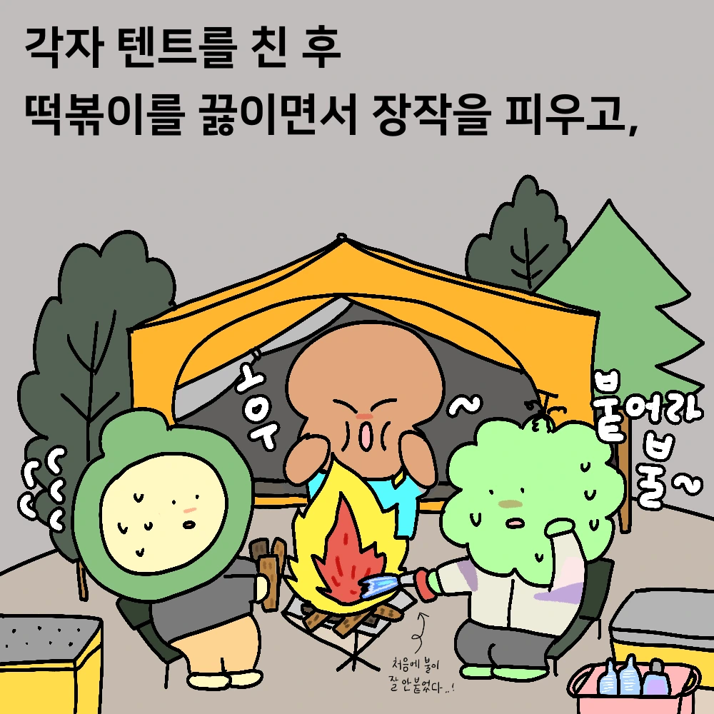 장작에 불이 잘 안 붙어서 불을 붙이는 데 조금 고생했는데 넉살 좋은 샤인이 옆 텐트에서 토치를 빌려와 불을 붙이는 데 성공!