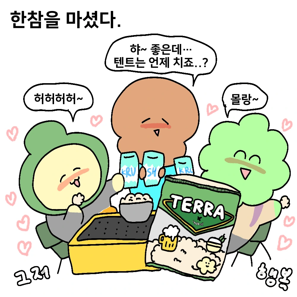 아니, 이게 왜 다 있는 거지? 혼자 세 명 분의 짐이 다 있는 것도 웃기고 각방을 쓰는 상황이 내가 생각했던 캠핑과는 전혀 다른 모습이라 웃음이 빵 터졌다.