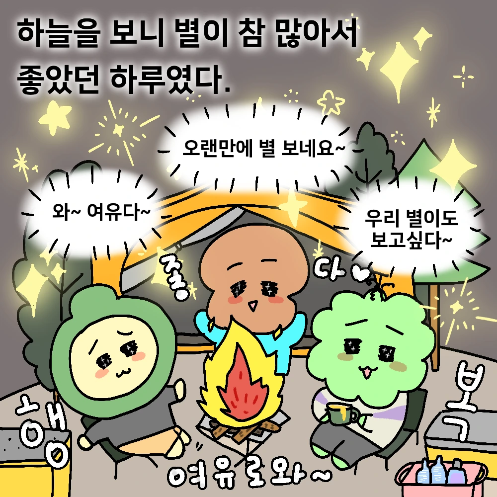 우리는 맥주랑 안주를 마시면서 모닥불 앞에 모여 수다를 떨고 하늘의 별을 봤다.