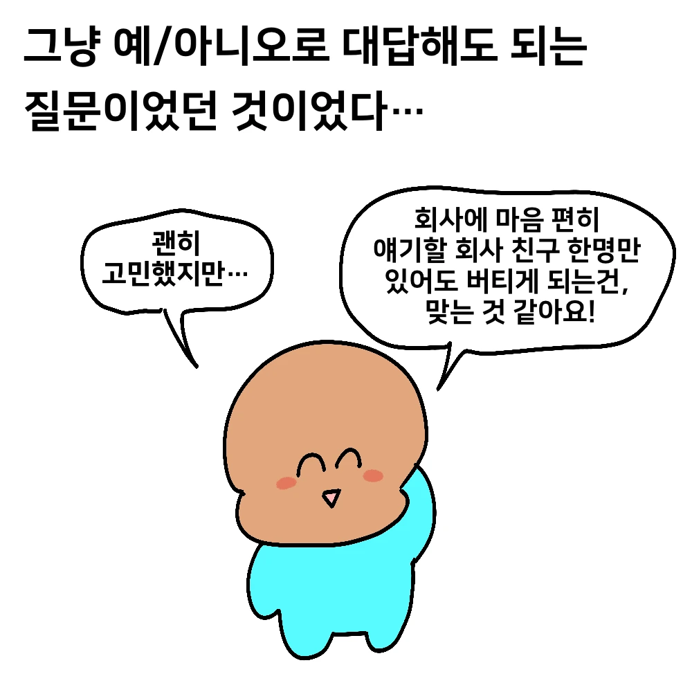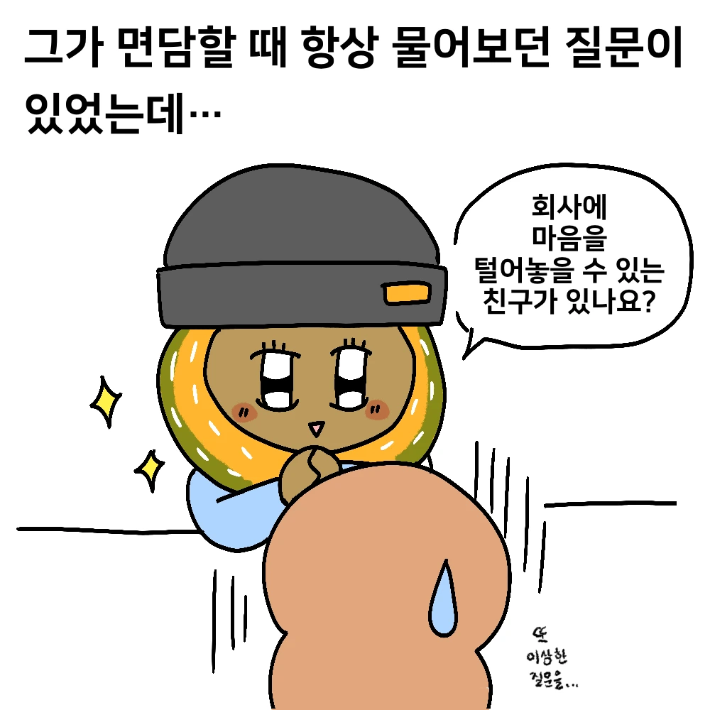 마음 맞는 친구 한 명만 있어도 회사생활을 버틸 수 있기 때문에 회사생활이 전반적으로 괜찮은지 탐색하는 질문이라고.
