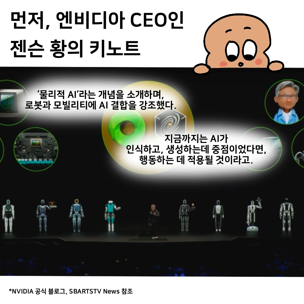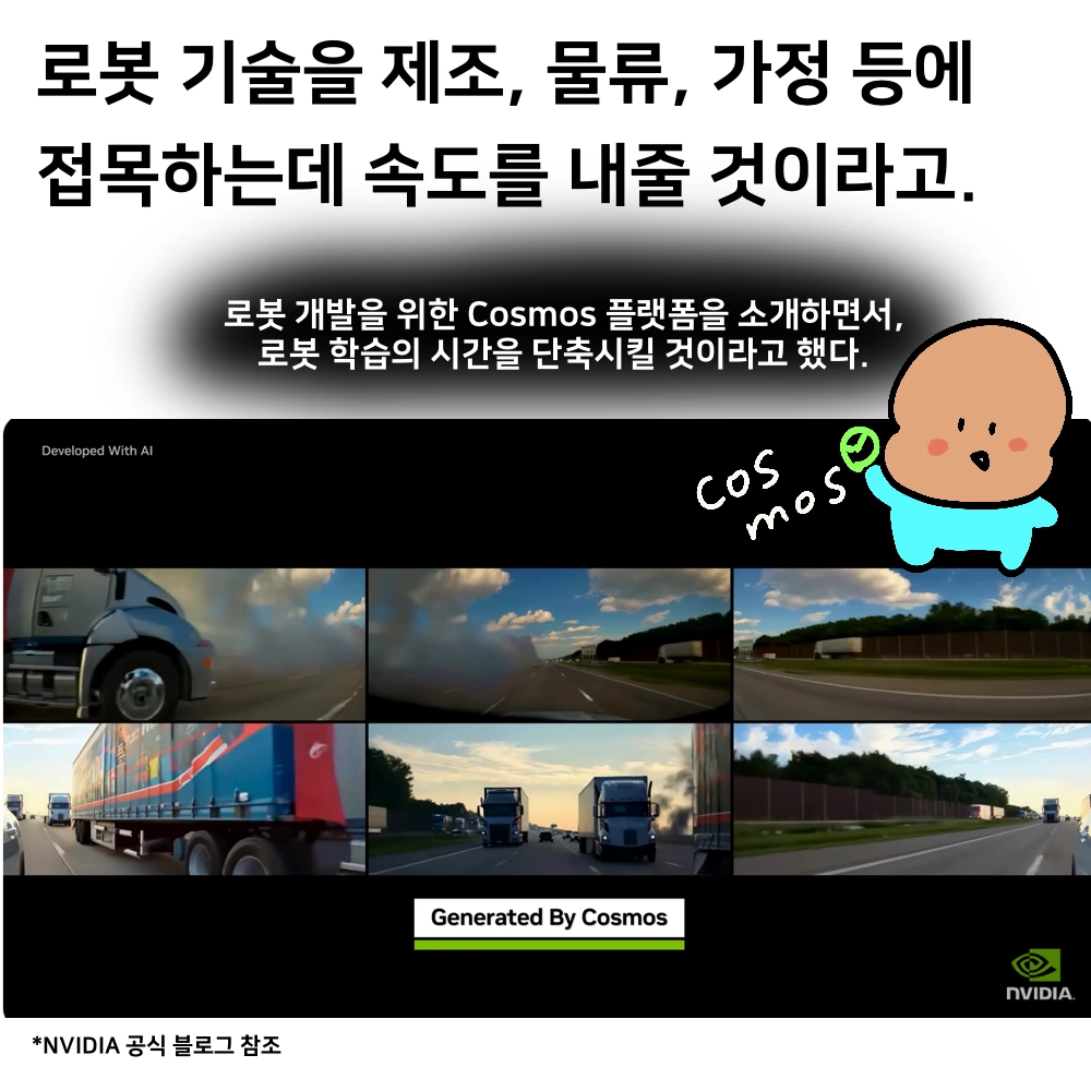 - NVIDIA의 젠슨 황 CEO가 키노트에서 소개한 ‘Cosmos’ AI 모델 - 물리적 AI의 시대를 열겠다고 선언했다. 기존에는 AI를 활용해 인식하고 생성하는 과정이었다면 이제 물리적인 형상과 조합해서 로봇, 모빌리티에 적용할 수 있게 하겠다고 했다. Cosmos 플랫폼을 활용해서 텍스트로 여러 가지 행동을 설계하기도 하고, 행동 시나리오를 짜는데 도움이 될 것 같다.