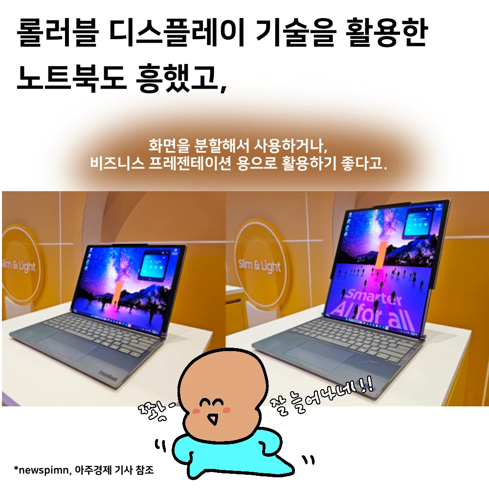 - 삼성디스플레이의 롤러블 OLED - 레노버 노트북에 적용된 세계 최초 롤러블 노트북 디스플레이를 공개했다. 확장하는데 시간이 좀 걸리고 가격이 비싸지만, 처음 시도인만큼 눈여겨볼 만한 것 같다.