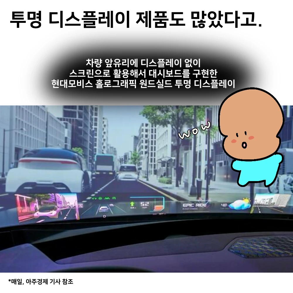 - 현대 홀로그래픽 윈드쉴드 디스플레이 - 차량 유리창을 디스플레이화 했다. 주행정보, 내비, 음악재생 등을 디스플레이에 표시했고, 현대모비스에서 2027년경 상용화하겠다고 밝혔다.