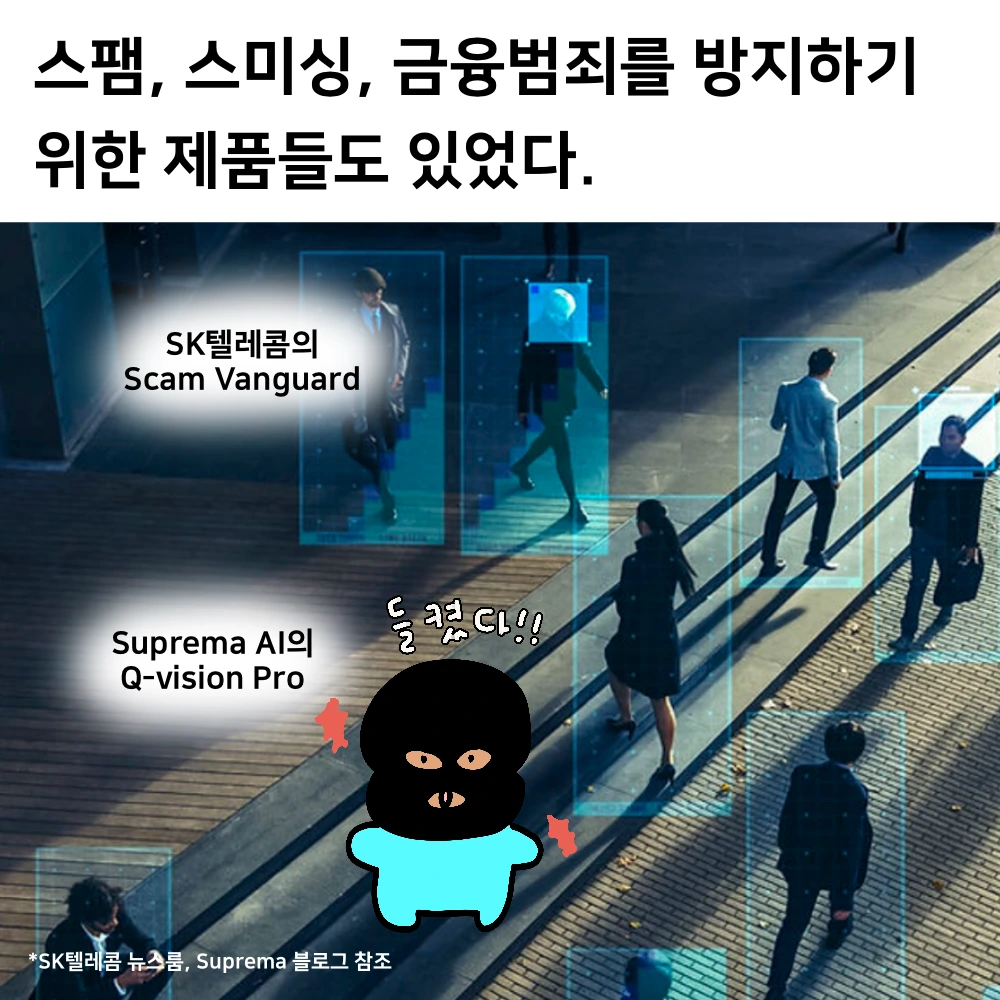 - SK텔레콤의 ‘스캠뱅가드’, 수프리마 AI의 ‘Q-Vision Pro’ - AI 기반 스팸, 스미싱, 금융사기 방지 기술들. atm주변의 금융범죄를 예측하고 방지도 가능하다고 한다. AI를 보안 측면에서 활용했다.