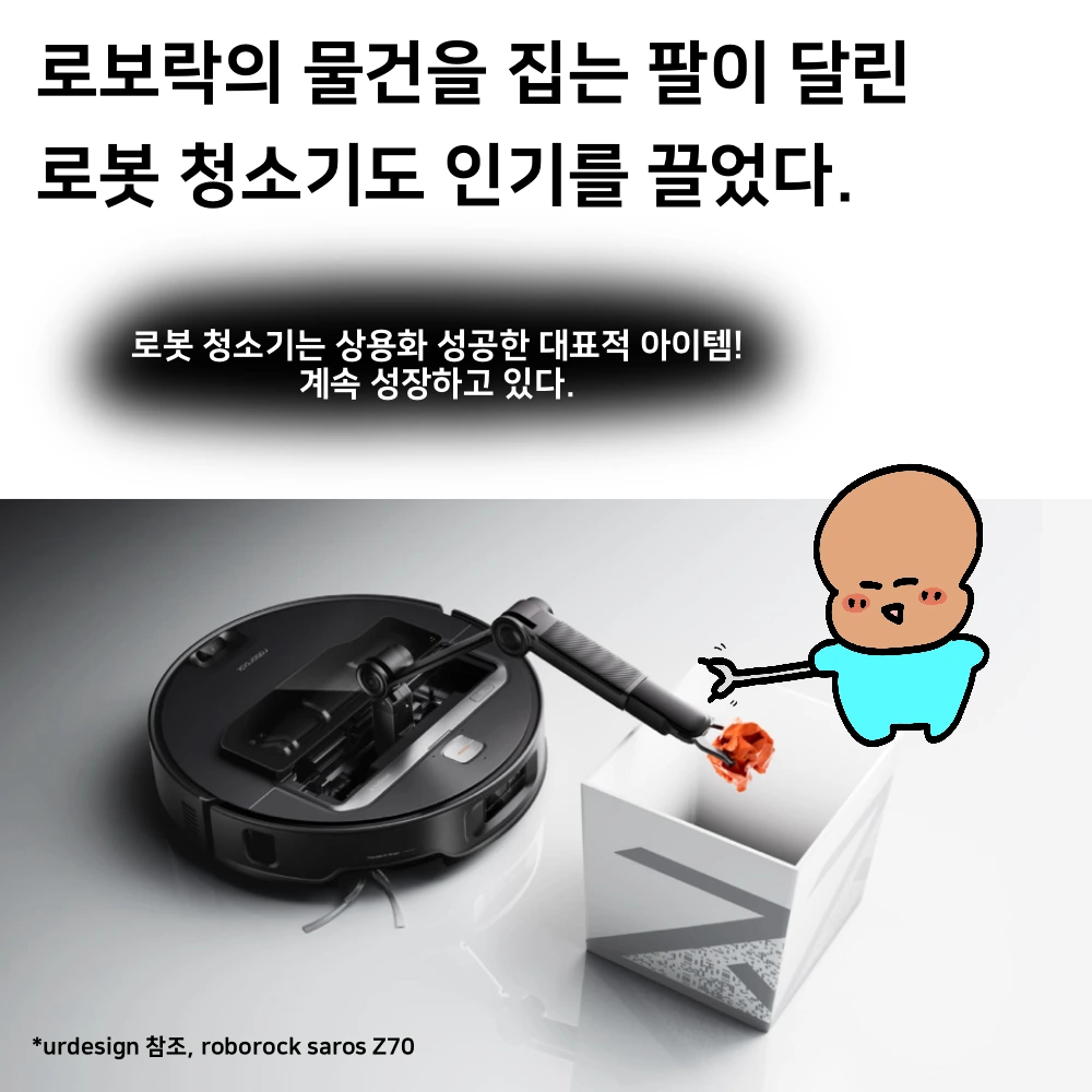 - 로보락의 Saros Z70 - 로봇 팔이 달린 청소기로 양말을 주워 담는 영상을 봤다. 로봇이라고 하면 기업용 로봇이라 일반적인 사용자들이 감이 잘 안 오지만, 가장 대중화되고 상용화된 게 로봇 청소기다. 로봇 청소기도 계속 진화하고 있어서 흥미로웠다.