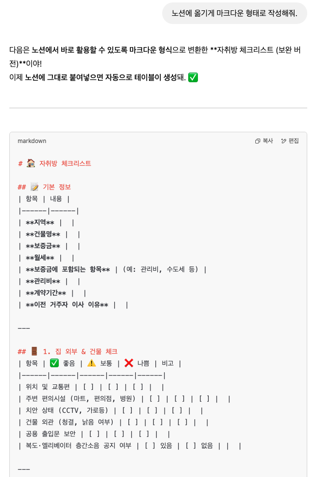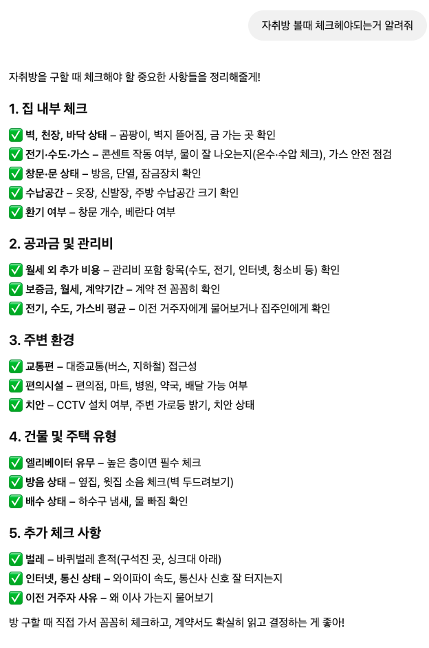 나는 "자취방 볼 때 체크해야 되는 거 알려줘", "집 보는 순서에 맞춰서 리스트업 해줘"와 같이 프롬프트를 입력했다.
