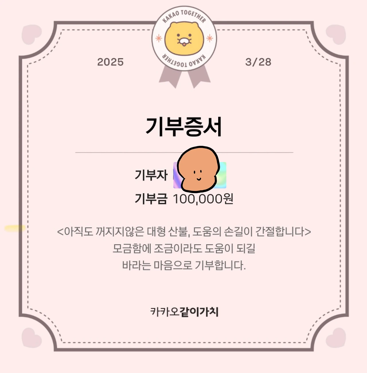 엄마 덕분에 나도 이번 산불 피해 모금에 작은 기부를 해보았다.
