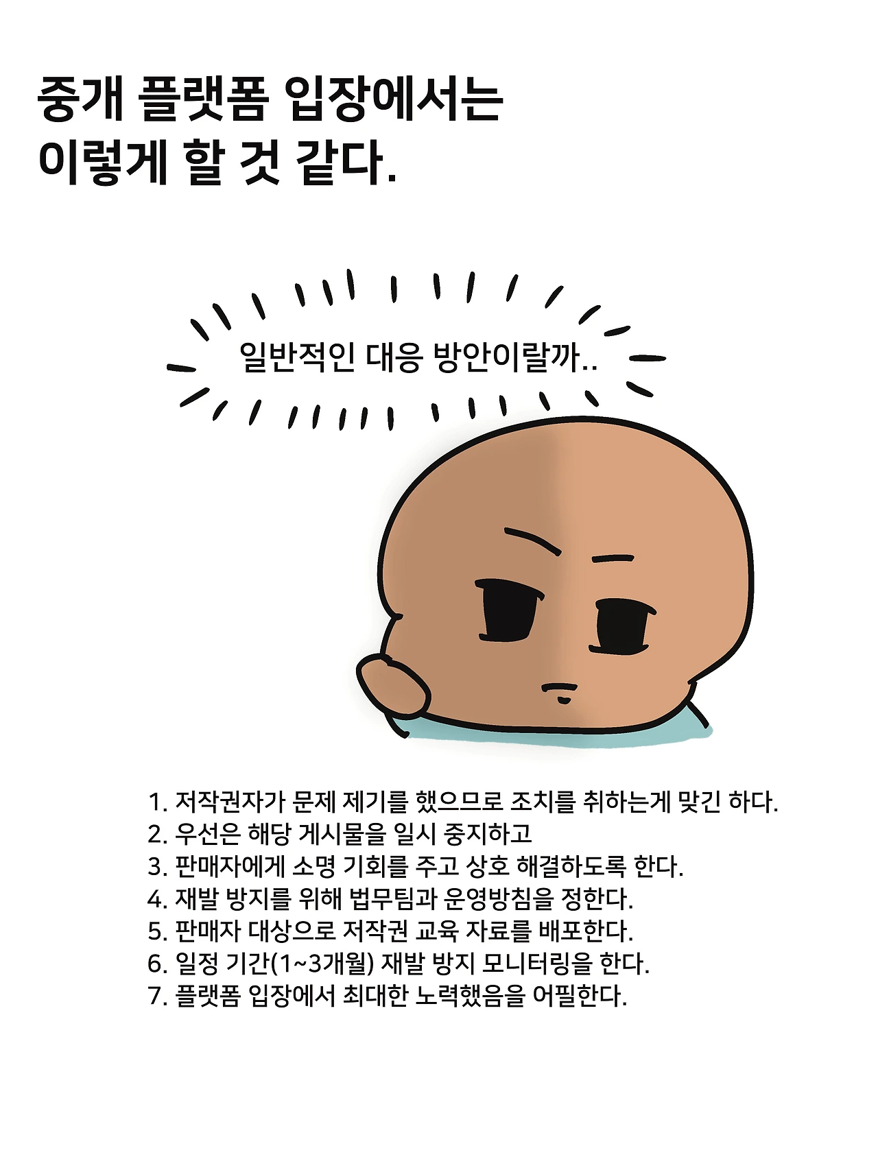 그리고 정책 가이드에 저작권 책임 소재에 대한 내용, 문제가 생겼을 때 플랫폼에서는 어떻게 대처할 것인지에 대한 내용을 추가한다. (법무팀이나 관련부서와 논의는 해야겠지)