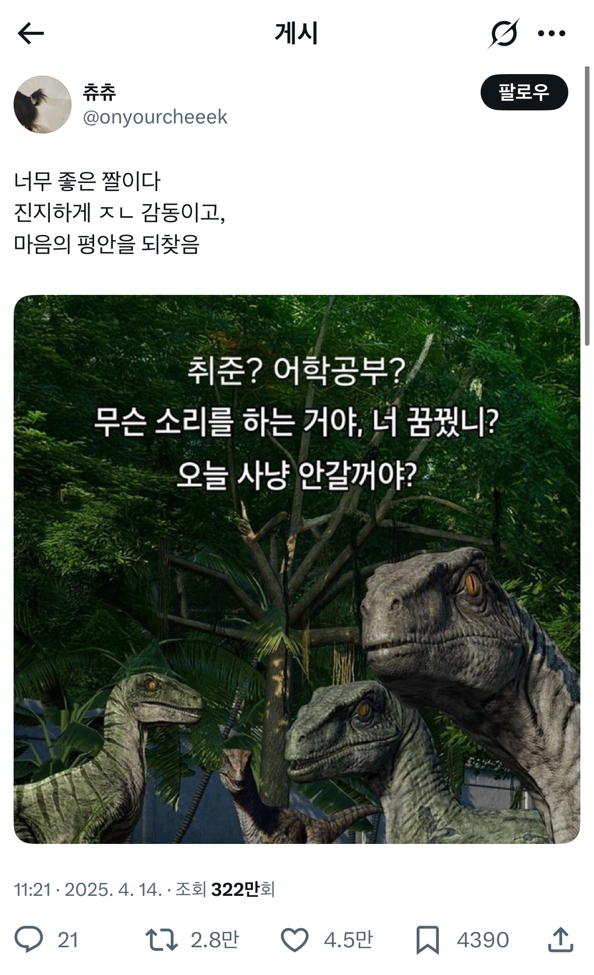 하는 내용이고 공룡 세 마리가 화자를 쳐다보고 있는 모습이다.