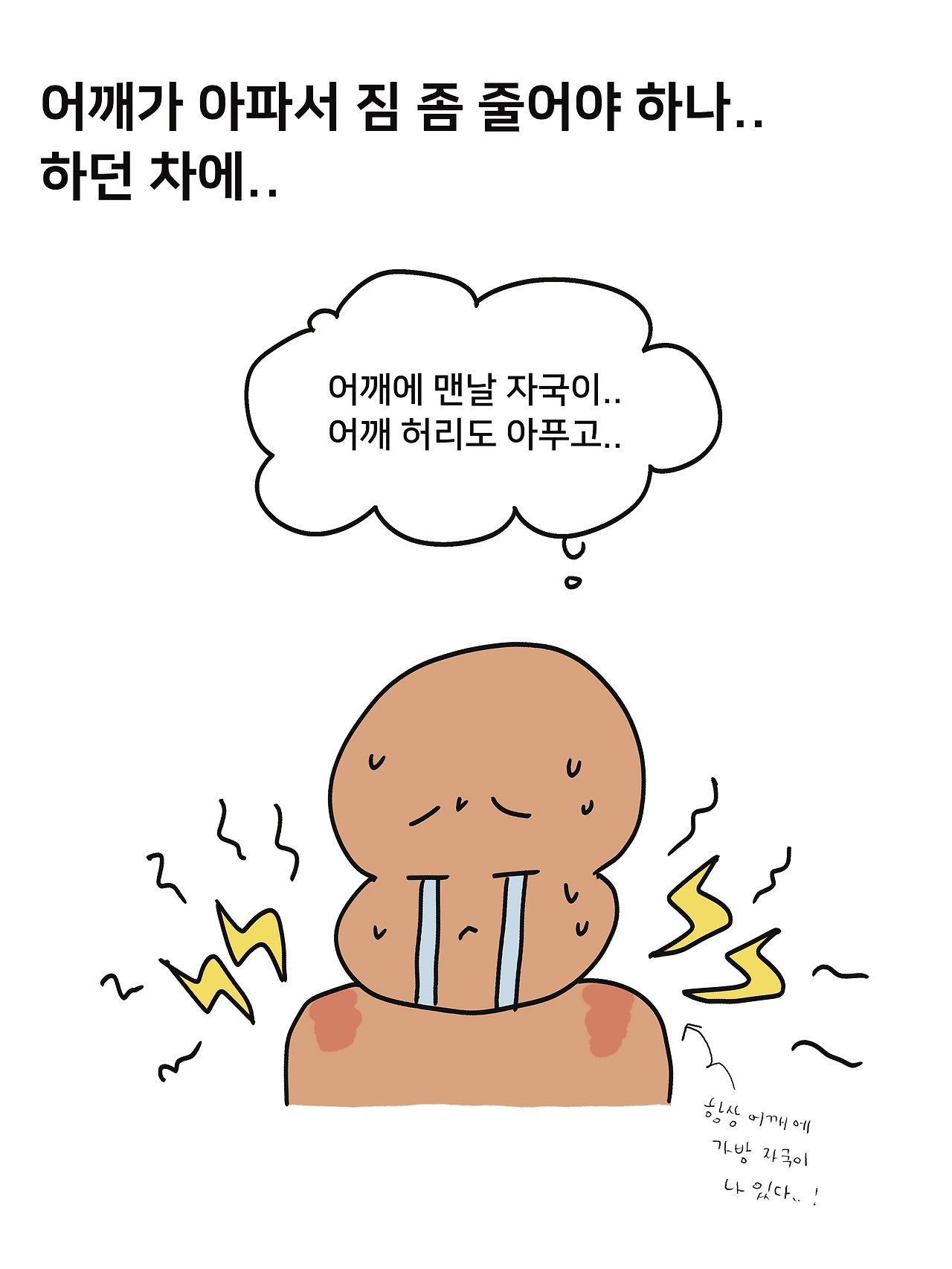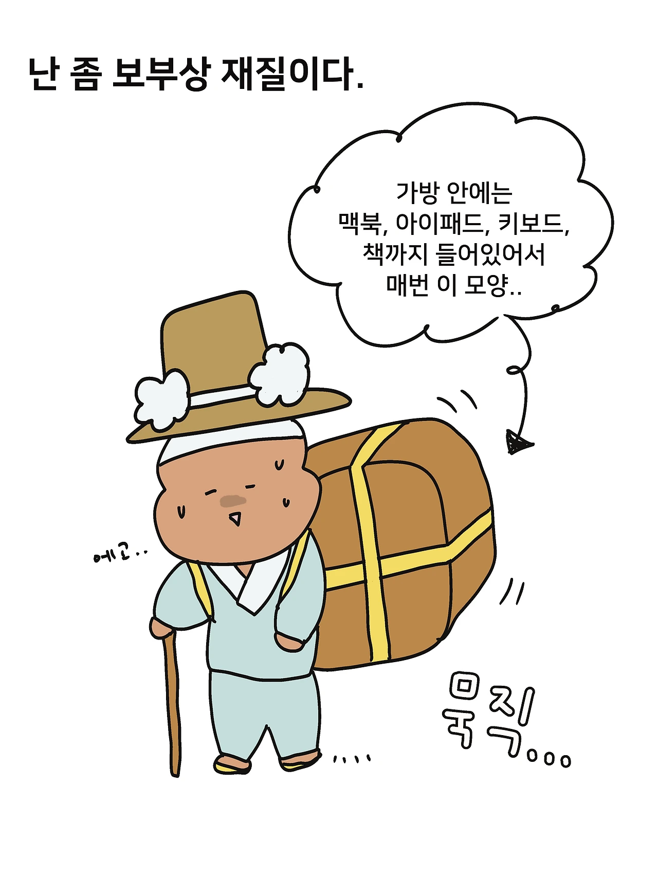 노트북, 아이패드, 키보드, 우산, 여분의 양말, 물통… 어느 것 하나 뺄 게 없다는 걸 깨닫고 좌절.