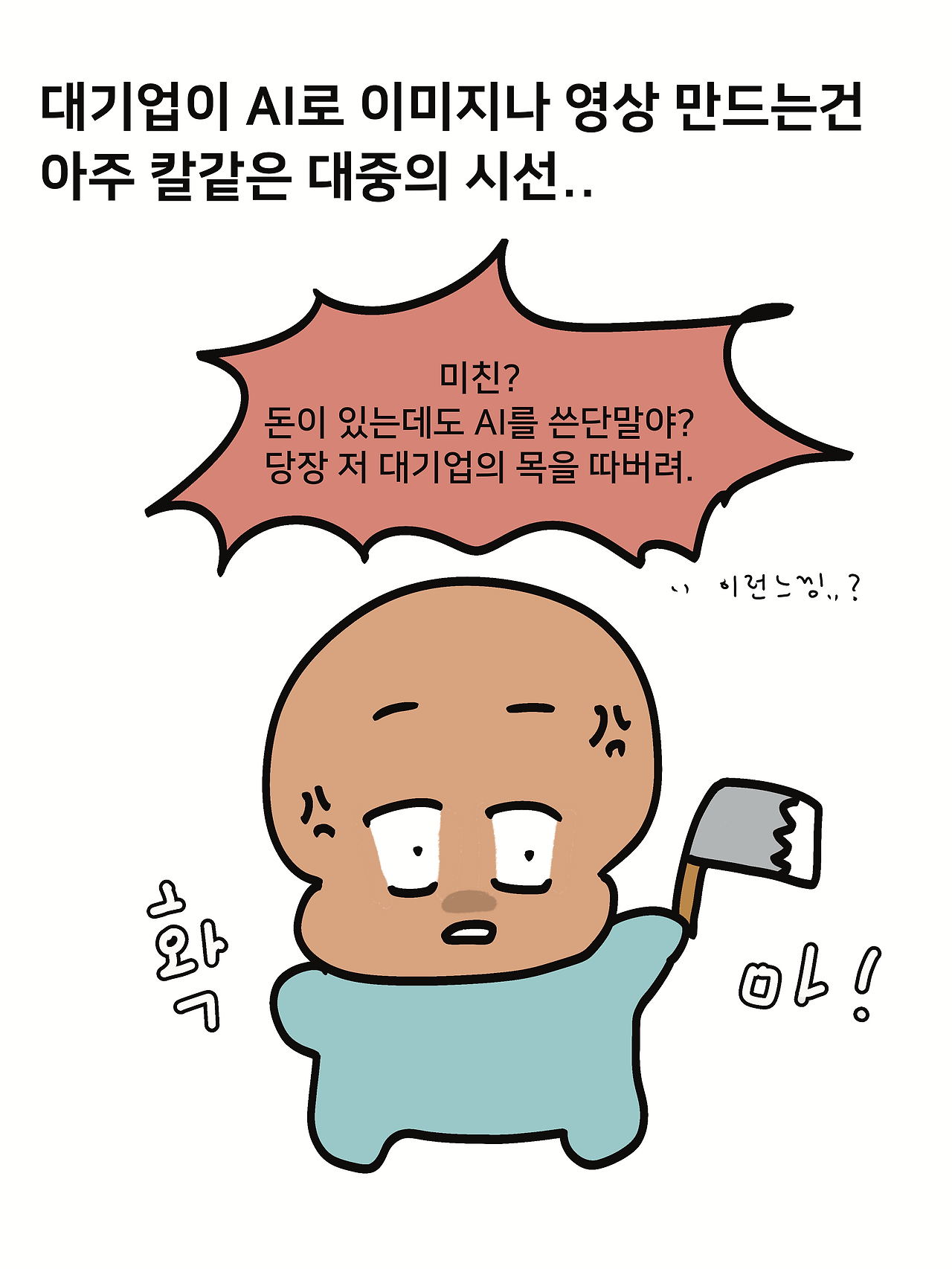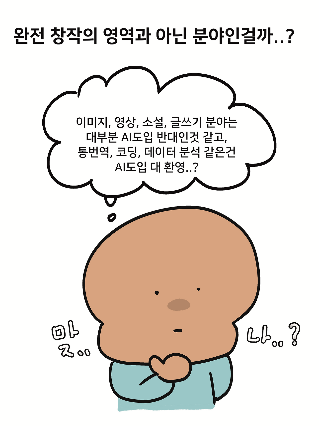 아무래도 창작 분야인 이미지, 영상, 소설 같은 분야에서는 AI도입에 대한 거부감이 훨씬 큰 것 같다.