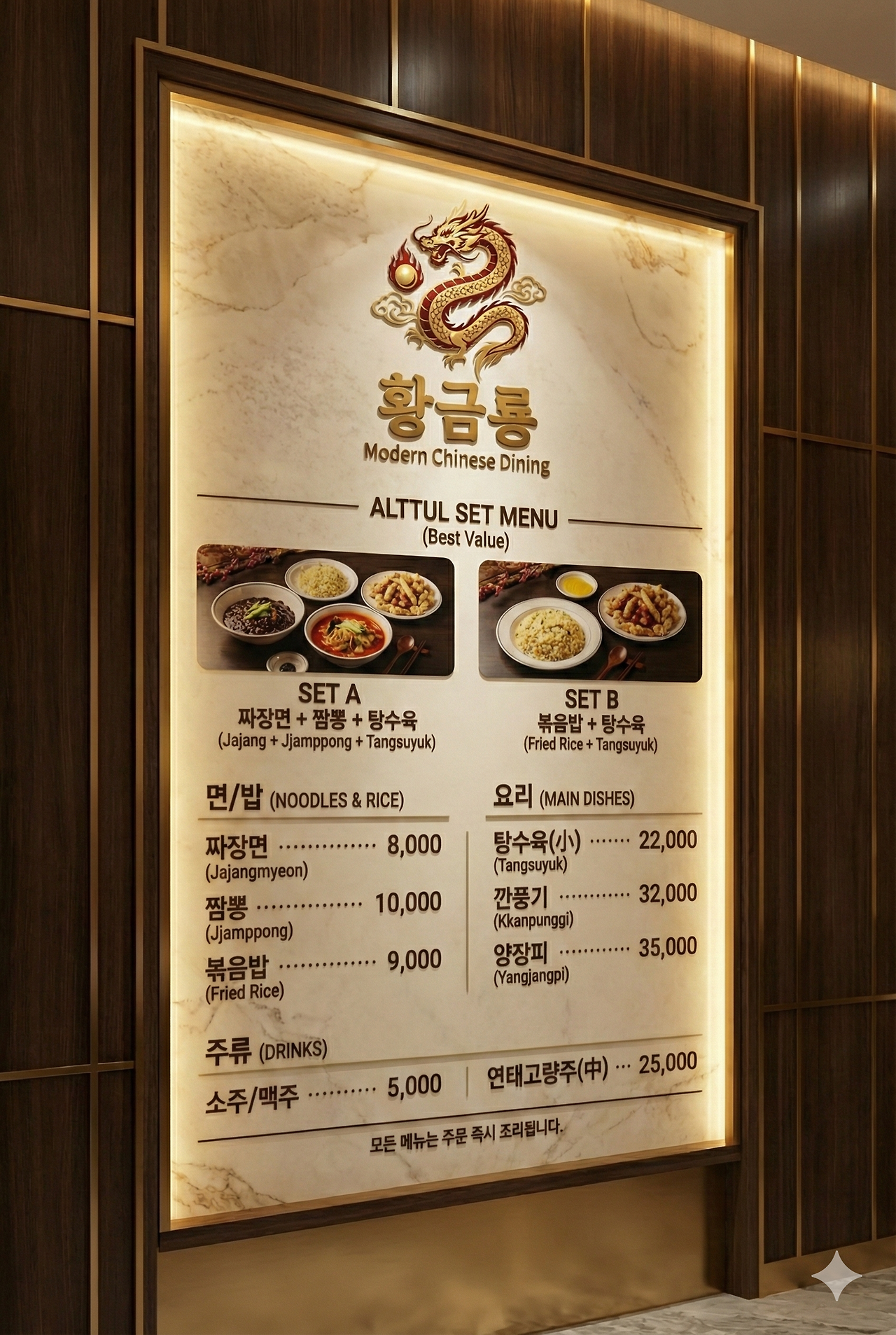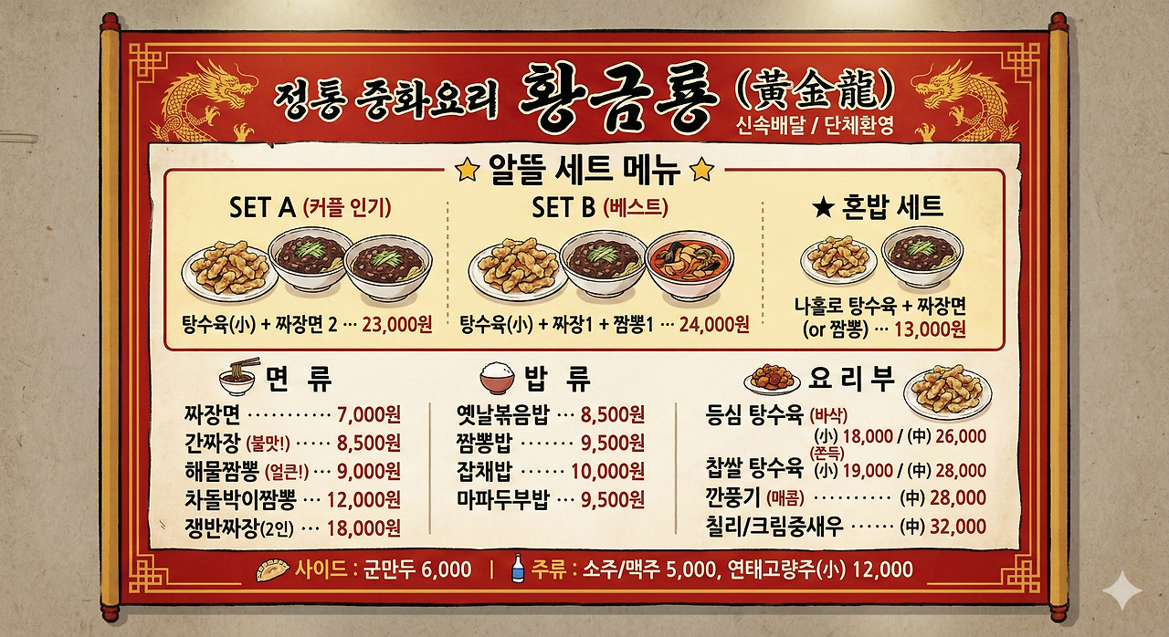전형적인 중식당 메뉴판으로 현재 시세 참고해서 만들어달라고만 했는데 이렇게 꾸려주었다.