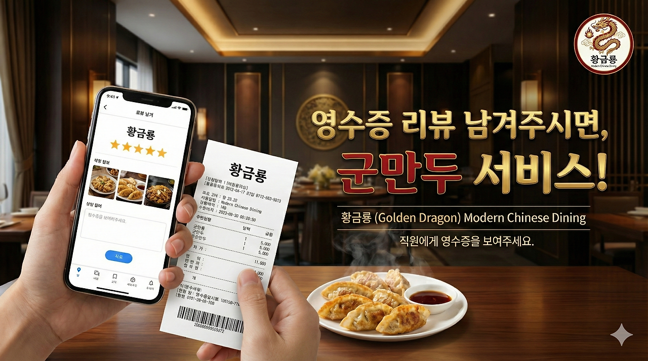 실사로도 필요할 것 같아서 영수증 리뷰 남기면 군만두 서비스 주는 배너 이미지도 만들어달라고 해봤다.