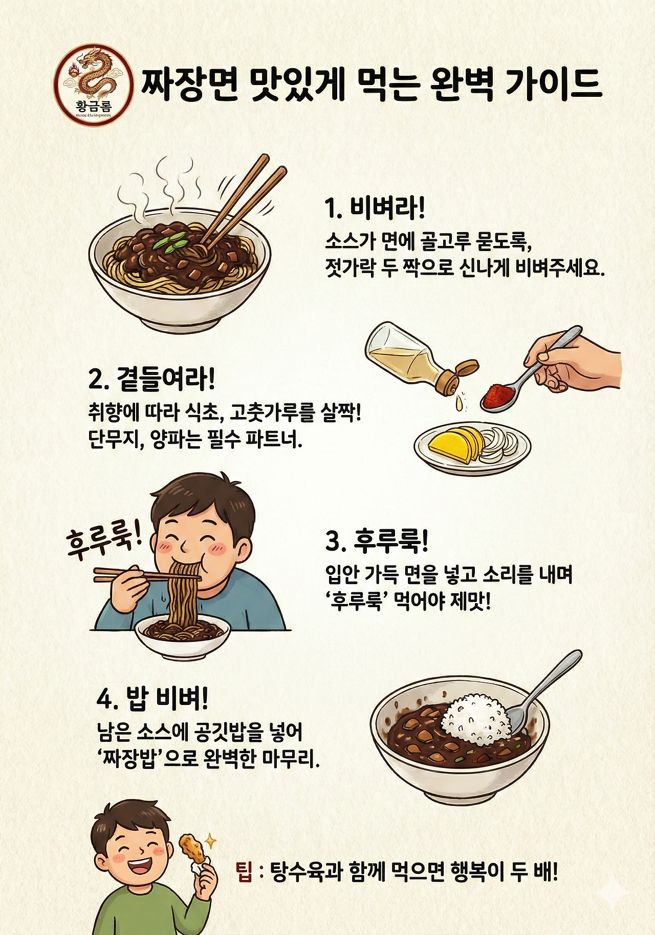 일러스트가 들어간 짜장면 맛있게 먹는 방법 가이드를 작성해 달라고 했더니 이렇게 만들어줬다.