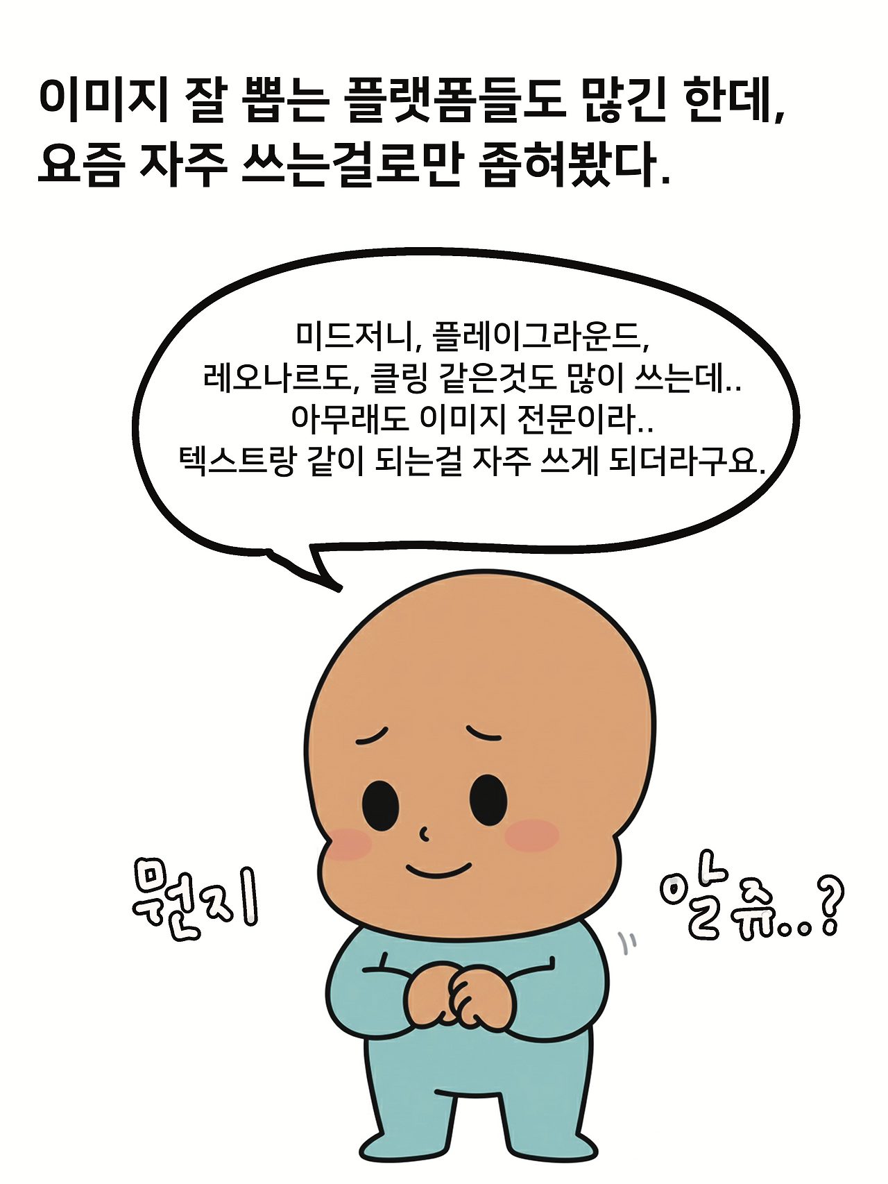 물론 미드저니, 플레이그라운드, 레오나르도, 클링.. 같은 이미지 특화된 플랫폼도 있는데,