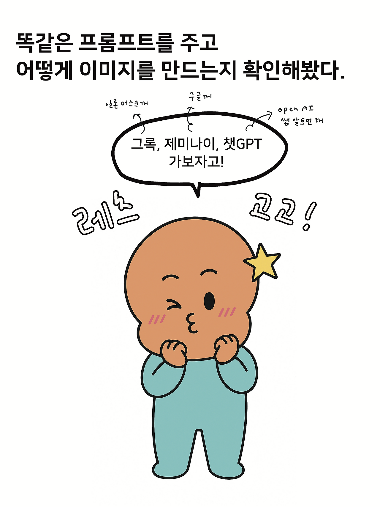 텍스트 생성도 되고 이미지 생성까지 모두 되는 그록, 제미나이, 챗GPT 끼리만 비교해 봤다.