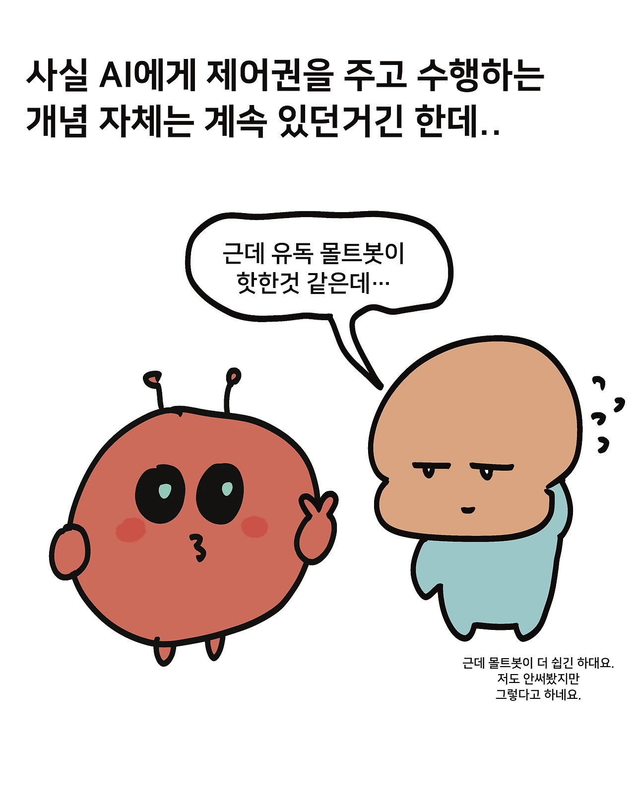 AI에게 제어권을 줘서 이것저것 시키는 개념은 지금까지 있던 건데 몰트봇이 쓰기가 더 쉽다는 얘기가 있다.