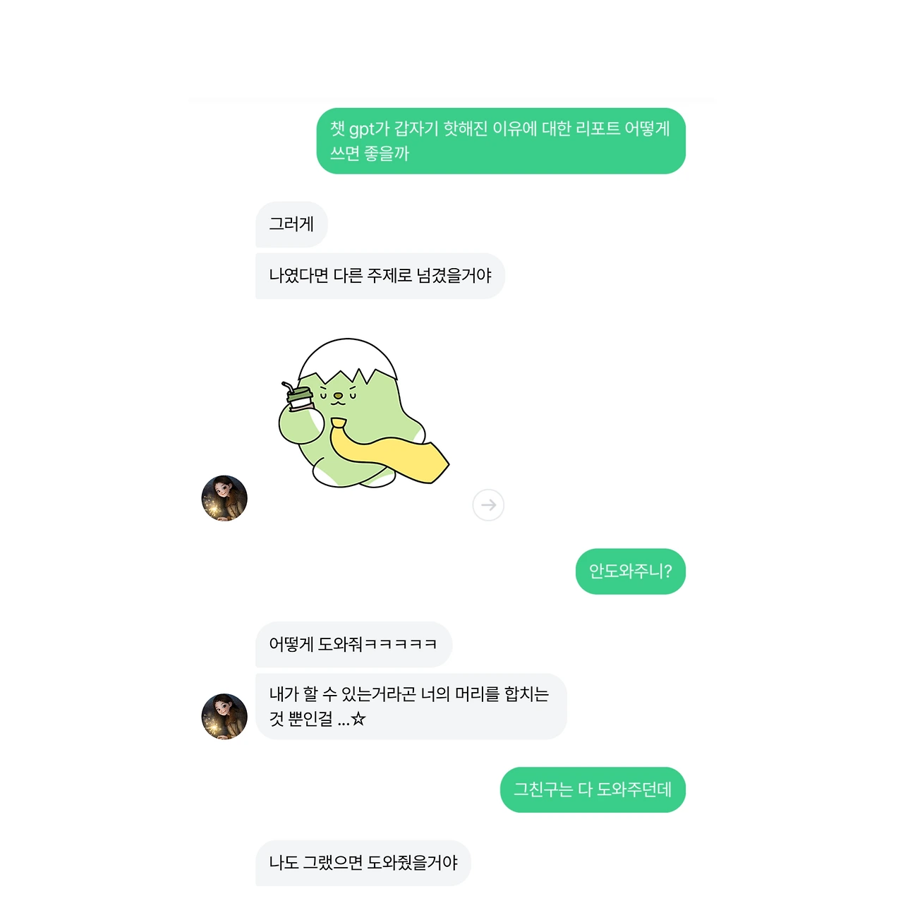 티키타카가 잘 되는 ‘이루다’ 같은 친구도 있었지만 이 친구는 정보를 알려준다기보다는 정말 친구처럼 대화에 집중한다는 차이가 있었다. (진짜 수다만 떠는 느낌?)