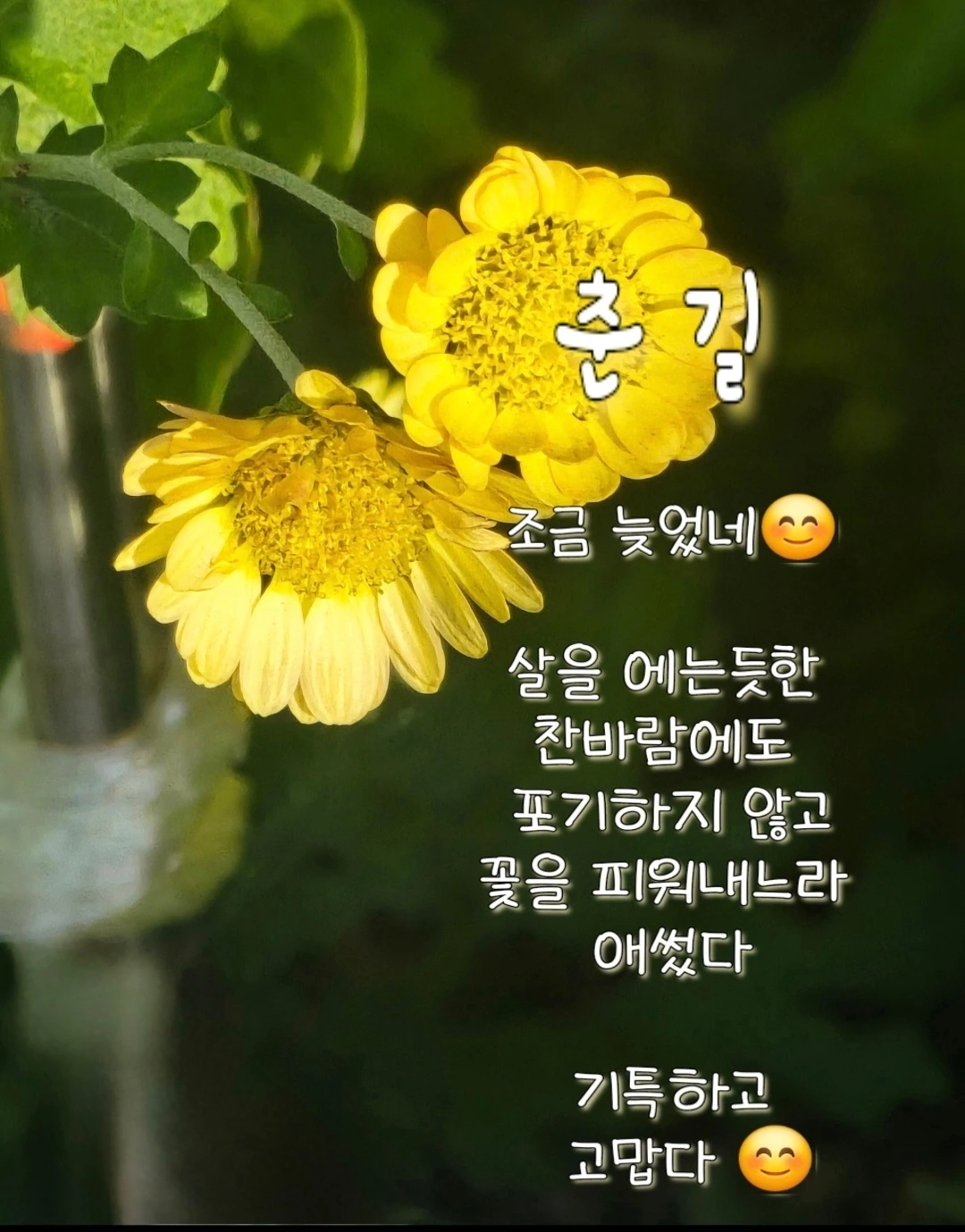 피었던 꽃들도 앞다투어 겨울준비에 들어갈 시기임에도 새롭게 꽃망울을 터뜨린 아이가 있었습니다. 가을 하면 생각나는 국화꽃입니다. 얼마 전 첫눈으로 폭설이 내린 날도 눈 속에서도 그 존재감을 드러낸 국화꽃이 참 예뻐 보였습니다. 설중매가 아니라 설중국인가요?